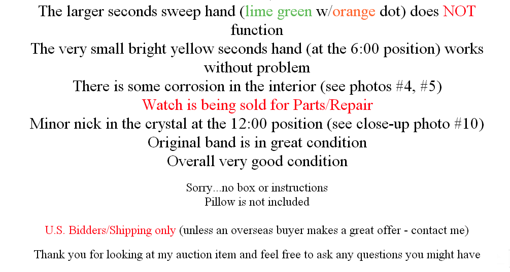 Only one question: How many reasons do you need to avoid ? (Unless you happen to be sat on a spare replacement dial / movement and dial ring). Incidentally, the reason for: The larger seconds sweep hand (lime green w/orange dot) does NOT function .... is plainly visible in the two photos of the movement - just in case you haven't read this thread (as the seller clearly hasn't). | |