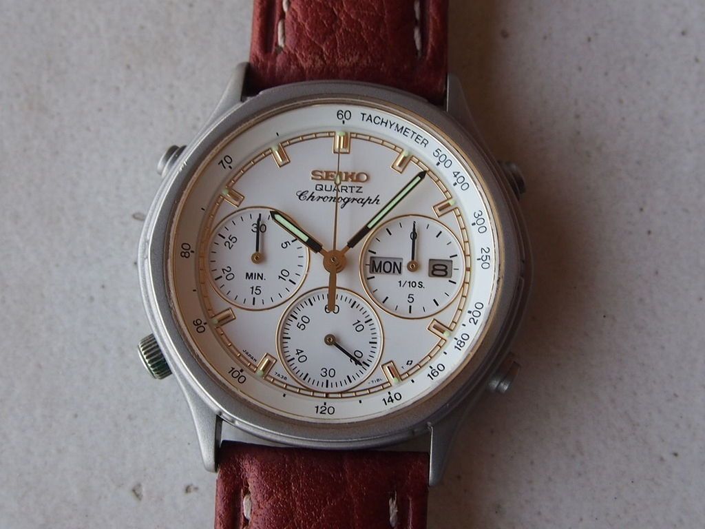 But it doesn't work on all 7Axx models. This 7A38-7260 was listed earlier this morning by an Italian eBay seller. The watch case was once an all-over gold tone finish - presumably suffering from badly worn plating. The bead-blasting has been reasonably well done, but to my eyes, it's just all wrong - especially with that blingy white dial. The rich tan coloured strap would have gone nicely with the original gold tone case. http://www.ebay.co.uk/itm/152470638299