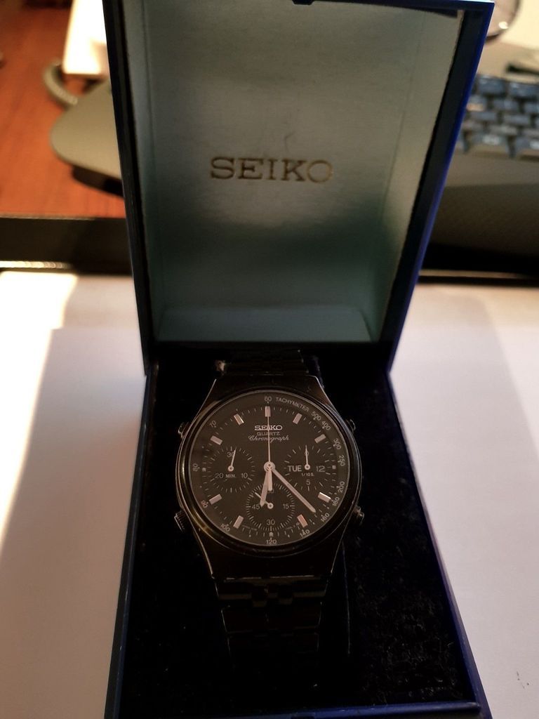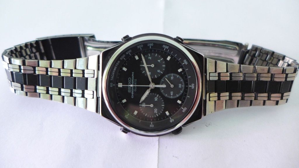 A rare model Seiko 7A38-7090. Came from original owner. With original box. Am selling a few pieces from my collection. Crystal has some surface marks, case in very nice condition no metal showing through. Original black bracelet, possibly re-coloured at some point. Runs fine everything works resets back to 12 perfectly, new battery. According to a previous buyer, there's definitely no 'possibly' about it. | |
