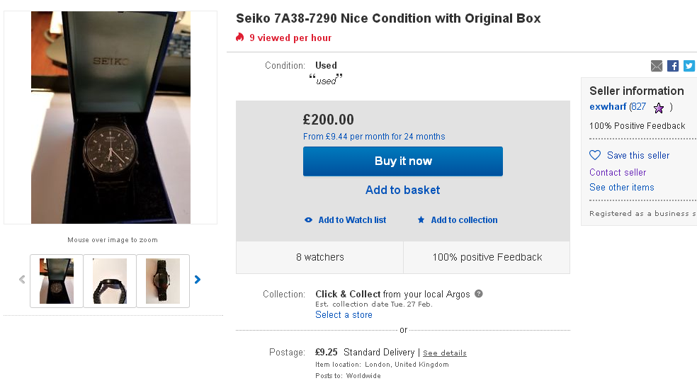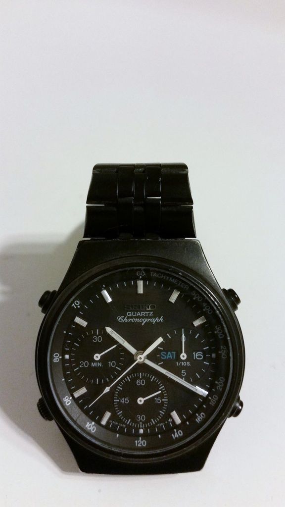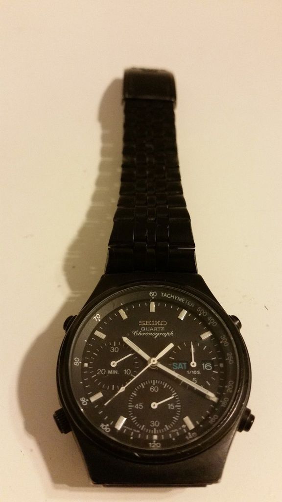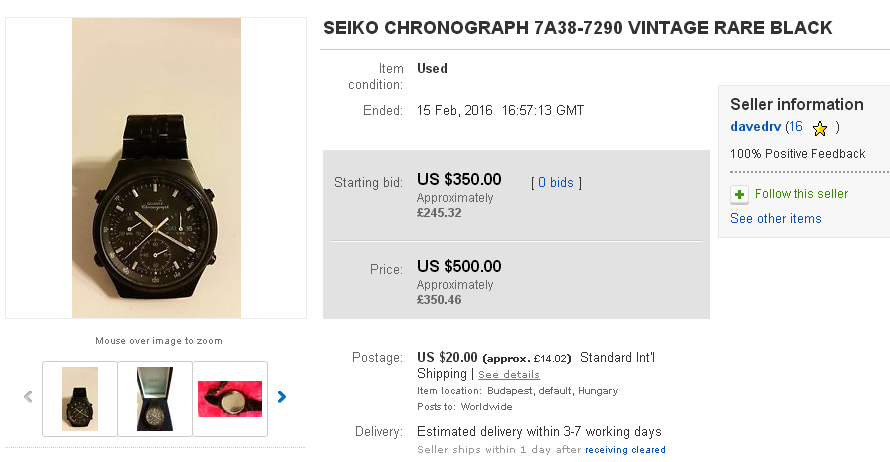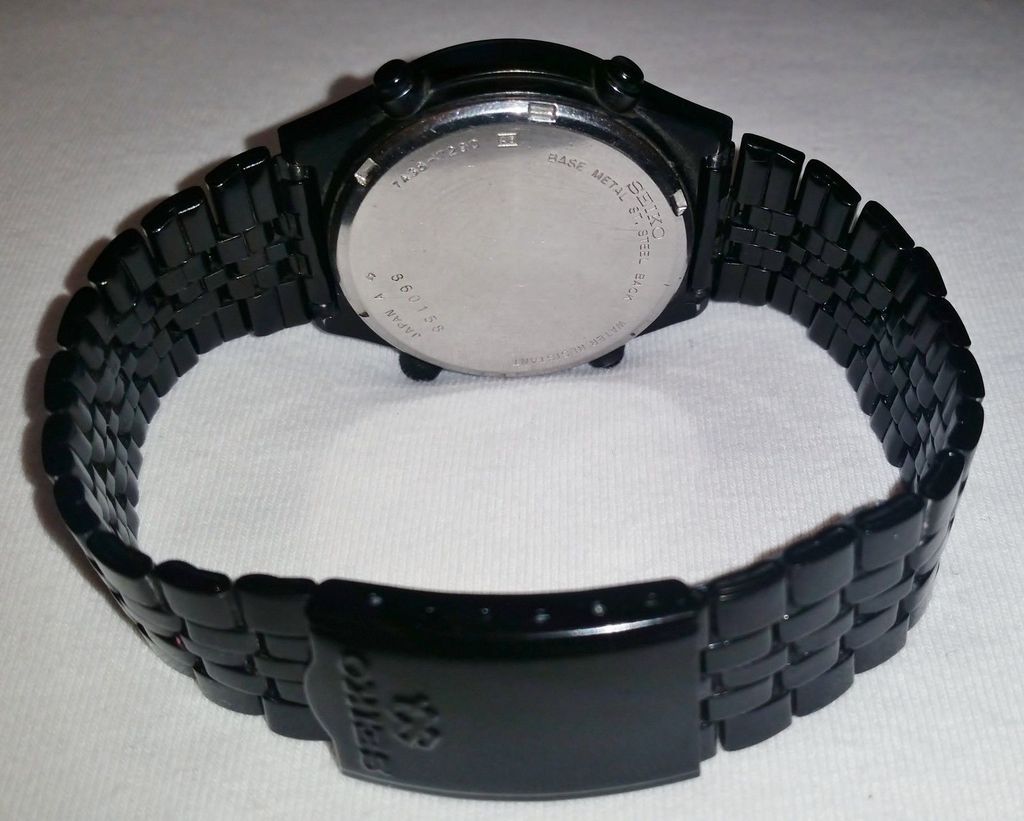 To date, most bad examples of re-finishing cited in this thread have concerned stripping of coatings and / or (gold) re-plating. There are a number of Seiko 7Axx's - both 7A28's and 7A38's which came in a black chrome plated finish, which is very vulnerable to rubbing wear. Some of these watches with the BCRP finish came in dark Brown (like the 7A38-6020 SAA041J) and dark Grey (like the 7A38-704x range). Then you've got the Black watches like the 7A38-6010 / - 6030; 7A38-7080; 7A38-7140 / -714A and 7A38-7290. All of these coated watches originally came in a matt finish, but soon take a polish with regular wear. The 7A38-7290 is particularly vulnerable to rubbing wear on the corners and bluff ends of the watch case. It's relatively easy to 'touch up' these watches using an aerosol spray can or airbrush. I think I've just spotted on such re-spray job. This 7A38-7290, then with evidence of rubbing wear was first listed on eBay by a Hungarian seller in the first week of February. http://www.ebay.co.uk/itm/291678137518