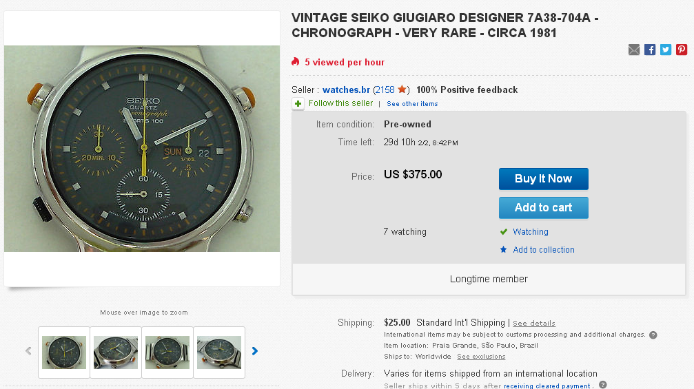 Be very careful of this one listed on eBay Italy earlier this evening - it's not quite what it seems. To the uninitiated, it may, at first glance, look like a stainless 7A38-7060 (on an incorrect bracelet), but it's not - look closer .... http://www.ebay.co.uk/itm/221454992344 Dalla mia collezione privata vendo: Cronografo Seiko 7A38, 15 rubini, cassa e bracciale in acciaio (non dell'epoca), con quadrante intatto silver. Il diametro è di 39mm, esclusa corona e pulsanti. Giorno della settimana in italiano e inglese. Funziona perfettamente. Le foto sono dell'orologio in vendita e sono parte integrante dell'inserzione.