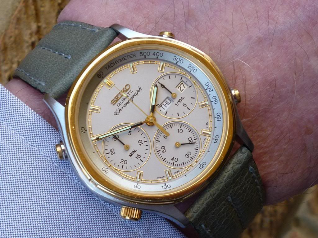 The flat top surface of the gold-plated bezel on the 7A38-724x / -725x / -726x's is prone to getting scratched / normal rubbing wear. But his is the first time I've actually seen anyone completely strip the plating off one of these bezels, in an attempt to disguise it. Apart from the gold plated pushers and crown, the biggest clue that something isn't quite right is stamped on the case-back .... BASE METAL BEZEL. For those not familiar with the model (there are plenty of photos in the WRUW thread), here's a couple of my two-tone 7A38-7260's. On the correct original Seiko grey leather strap: