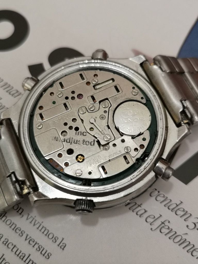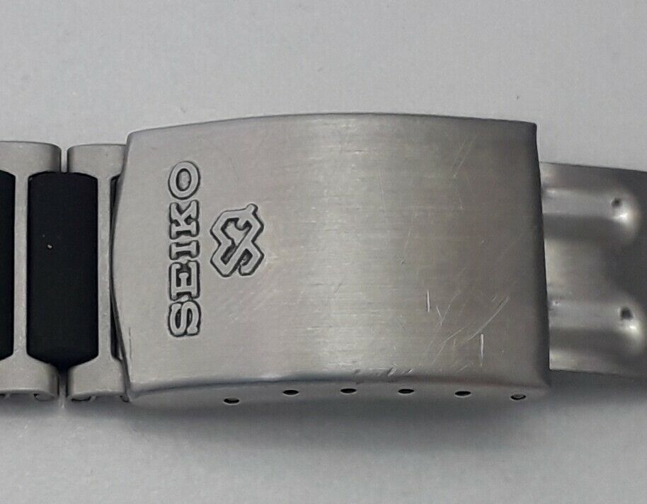 As you can see, from studying the photos, they've crudely scraped and sanded most of the black chrome coating off the watch case, but leaving the sides black, so it better matches their chosen ill-matched incorrect replacement bracelet. Going by the lack of wear to the bezel and case-back, this was probably a decent example of a ZFM 7A38-7085, before these butchers got their hands on it ! | |