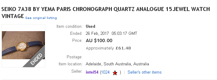 'Famous last words' from my first post in this thread - I can always move it. It's been well over a year since I last added anything to this thread - indeed I'd apparently almost forgotten it existed. Last week, Friday 24th February 2017 to be precise, an Australian eBay seller intel54 listed a very subtle Yema N8 Franken. In hindsight, it was anything but subtle - I simply failed to recognise it for what it was and proceeded to write it up as if it were any 'normal' Yema N8 in the Yema N7s and N8s spotted on eBay, LeBonCoin and Yahoo.jp thread (content now moved here). Ironically, I started off my post there with: Difficult to miss this one, with the first two words of the title being 'Seiko 7A38'. More so that I followed up with: You'll note there's no mention of the Yema N8 model number in either his title or description. And especially seeing as there's a similar precedent (of sorts) higher up this page .... See my post dated April 11th, 2013. http://www.ebay.co.uk/itm/322433264378