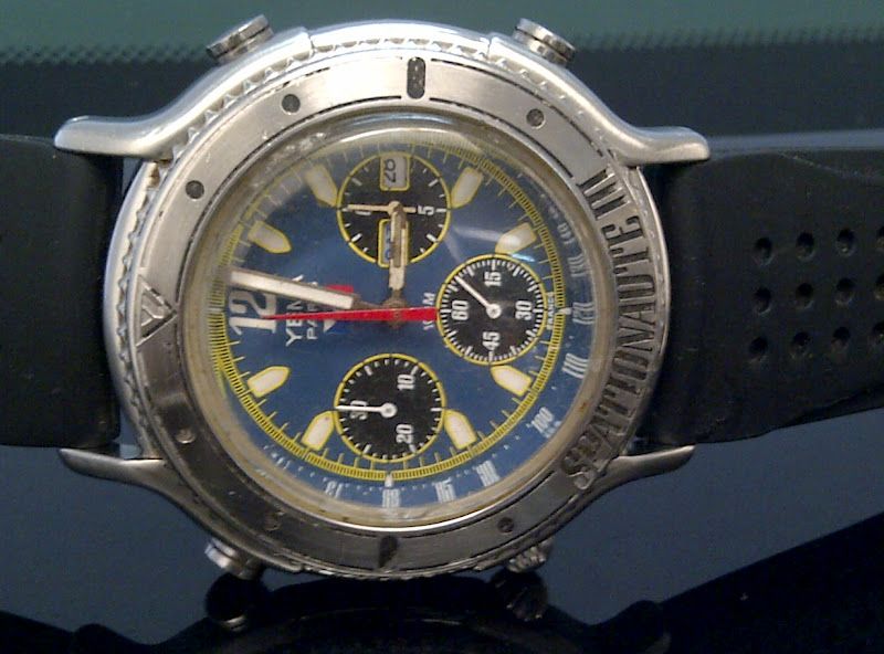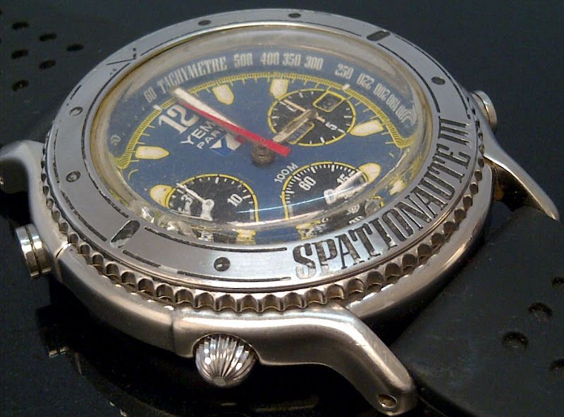 Truly a horrible example of a botched-up Yema Spationaute III, fitted with replacement acrylic crystal and non-original sweep hand. | |