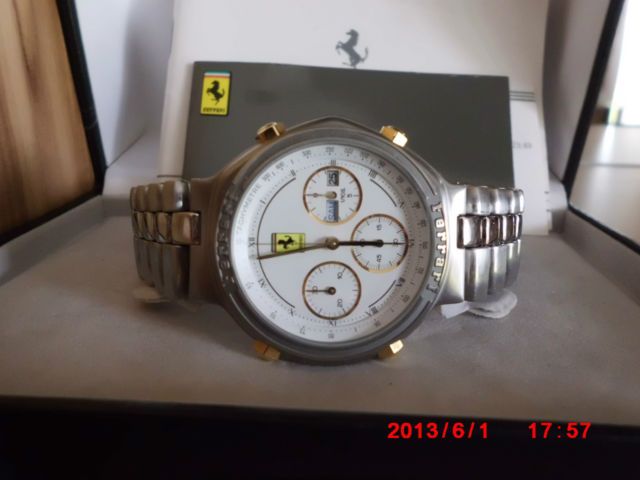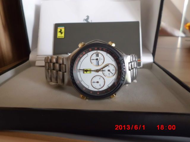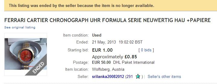 Speaking of Cartier Ferrari Formula's and eBay, there's one seller who regularly deals in these that I'd personally avoid at all costs .... Not only for his constant inconsistent spurious listing activities, such as starting with low opening bid prices, with no reserve set, then ending listings early (allegedly because the item is no longer available - but they nearly always re-appear, usually after a month or so), alternating that with 1000+ Euro Buy-it-Now prices, but also because it's becoming patently obvious that he likes to mess about with his watches. I am of course referring (once again) to the Austrian seller SriLanka20082012 who usually lists them on eBay Germany. I'm currently in the process of trying to work out exactly how many different genuine permutations of Ferrari Formula were produced. As some of you may already have read, I've started writing up the topic in this forum section. It involves wading through nearly 1500 photos that I've right clicked and saved, from eBay listings and elsewhere - 'sorting out the wheat fron the chaff', so to speak. Over the last three and a half years, I've seen a disconcerting number of Ferrari Formula chrono's that obviously weren't what I'd class as 'right' (i.e. correct and original) - the obvious mis-matches; 'early style' dials in 'later style' case and bracelets; wrong colour Tachymeter rings, etc. Most of them seem to emanate from eBay Germany, and particularly from this seller. Yesterday he produced another 7 new eBay listings, which included two absolute classic examples of his 'Mash-Ups'. Both are the 'later style' case and bracelet and predominantly stainless examples (all his current auctions use the same listing title): FERRARI CARTIER CHRONOGRAPH UHR FORMULA SERIE HAU CHRONO NEUWERTIG AUS SAMMLUNG http://www.ebay.co.uk/itm/140989663535