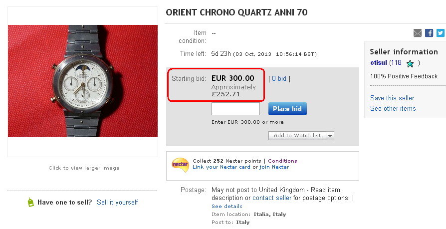 The Italian would-be seller re-listed it yesterday: http://www.ebay.co.uk/itm/221289561967 300 Euros !!! | |