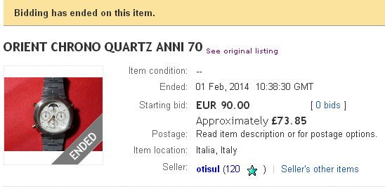 My how time flies. That Seiko 7A48 / Orient J38 Franken has been re-listed numerous times since. Last time I added it to my eBay watching page, in August, the price had come down to 75 Euros - still no takers, thankfully. http://www.ebay.co.uk/itm/221271496429