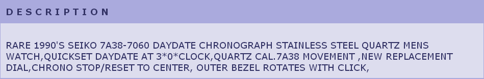 This comment about SriLanka20082012's spurious eBay listing activities probably better belongs in the eBay section, rather than the non-Seiko 7Axx section, but as it's context within this thread, and - just in case any reader thinks I am being unfairly critical of him ..... Yesterday he produced another 7 new eBay listings, which included two absolute classic examples of his 'Mash-Ups'. I'll happily state now, that IMHO, the other 5 of those 7 listings were for perfectly correct-looking examples in very nice condition. But one of them wasn't quite so new: http://www.ebay.co.uk/itm/140989656548. Not only for his constant inconsistent spurious listing activities, such as starting with low opening bid prices, with no reserve set, then ending listings early (allegedly because the item is no longer available - but they nearly always re-appear, usually after a month or so) http://www.ebay.co.uk/itm/140975073072 - less than two weeks ago, in this case !