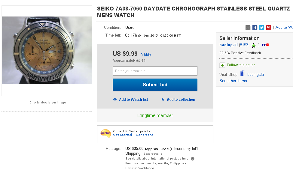 In case any readers may have missed my post on page 4 of the Heads Up on yet another 7A38 Franken(s) - Part 2 !! thread .... I guess it won't hurt to add a copy of it to this thread, where it fits just as well. Originally posted by myself on May 25, 2015 at 8:47 AM: I believe the current in vogue expression is: Made me want to throw up in my mouth (with or without 'a little bit'). Well, when I clapped eyes on Filipino arch watch botcher Badingski's latest http://www.ebay.co.uk/itm/201355942154