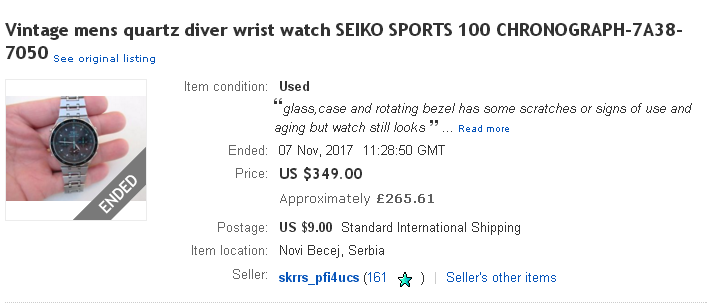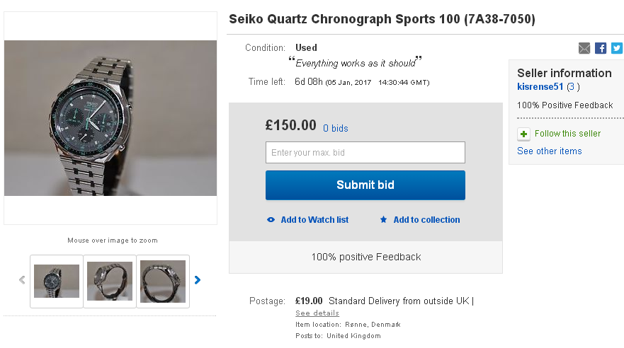 Update: Intrigued as to what the watch might actually have sold for, I sent another message to the Danish eBay seller yesterday. He didn't reply until this morning: Hello Happy New Year to you. I got several offers, chose to sell it to a guy from London, for 400 pounds. He'd also asked my advice on setting a price for another Seiko he was considering selling, so to make sure there wasn't any confusion, I asked him to confirm that we were talking about the same watch. He replied: