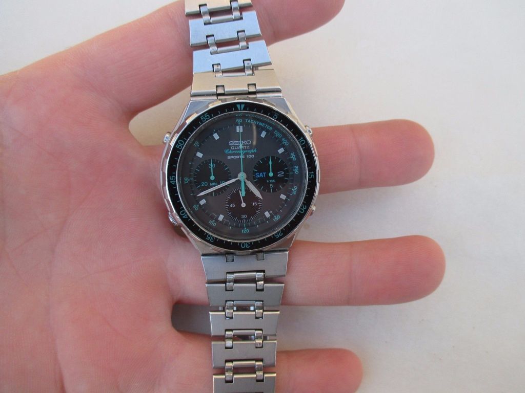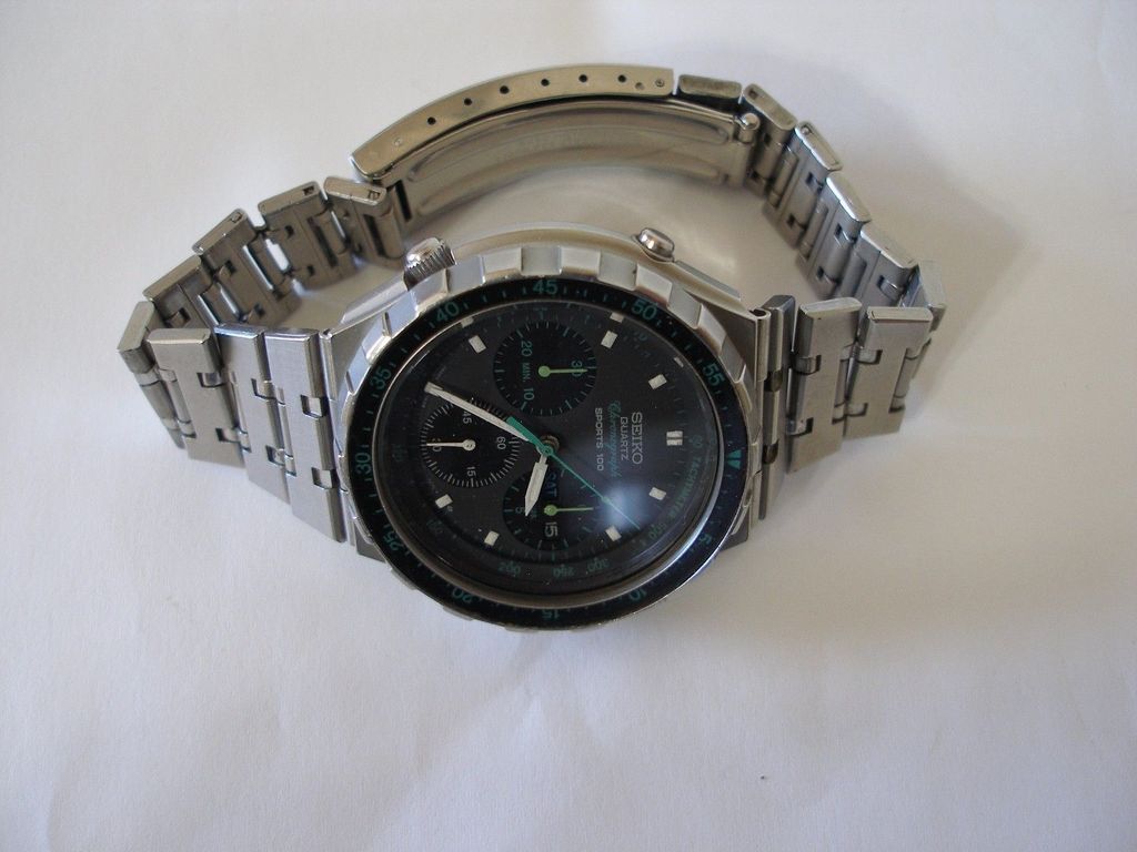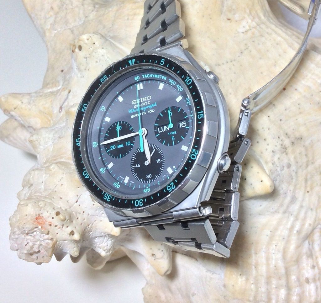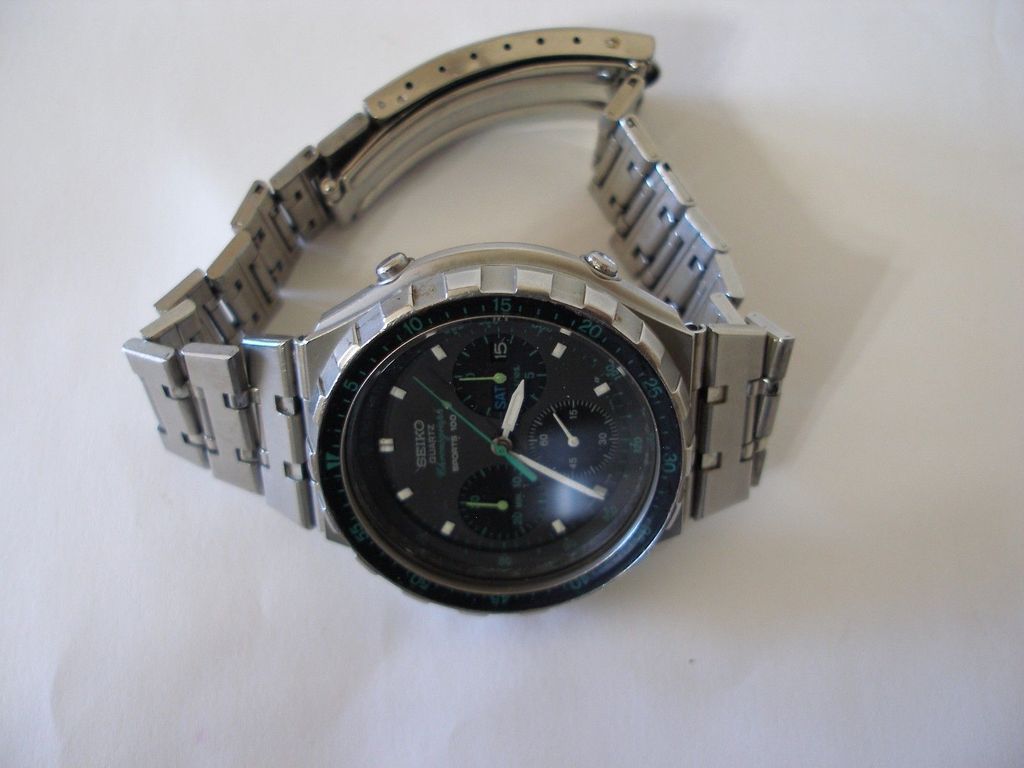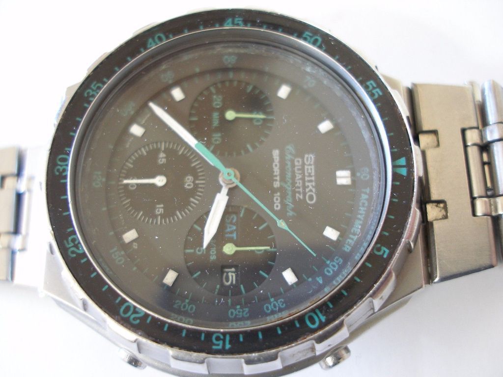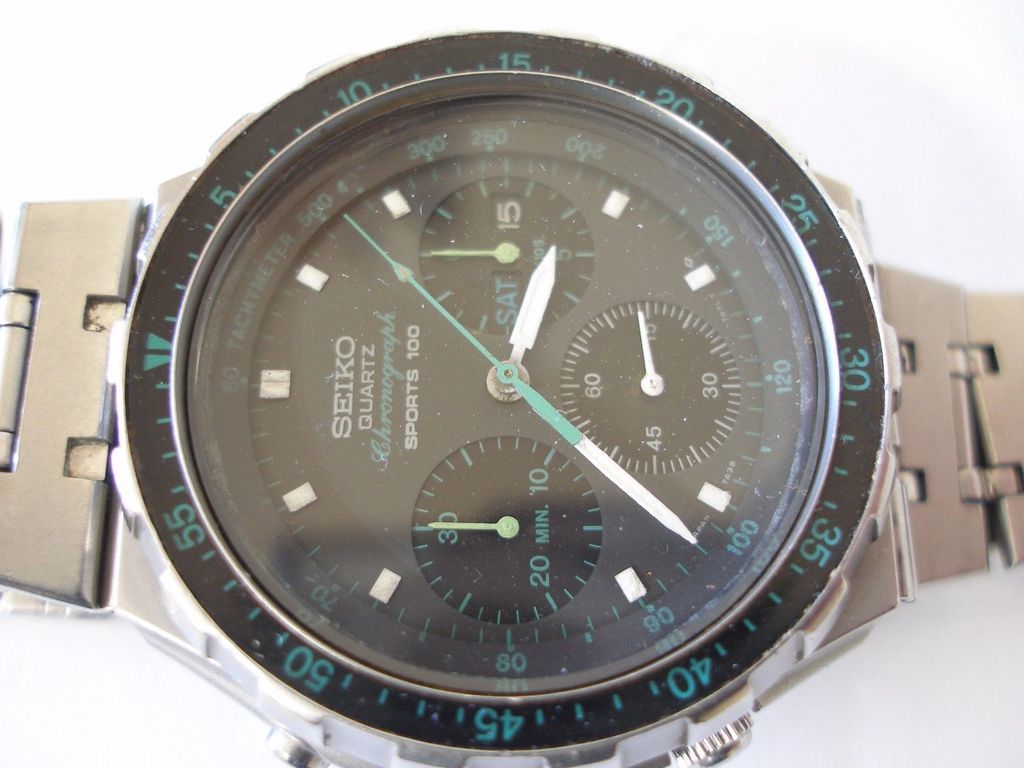 For sale is vintage mens quartz wrist watch SEIKO SPORTS 100 CHRONOGRAPH 7A38-7050 GREEN -watch is working good and keeps accurate time -please look pictures for details -please read description -new battery -original Seiko metal bracelet (has signs of wear) Happy Bidding! | |