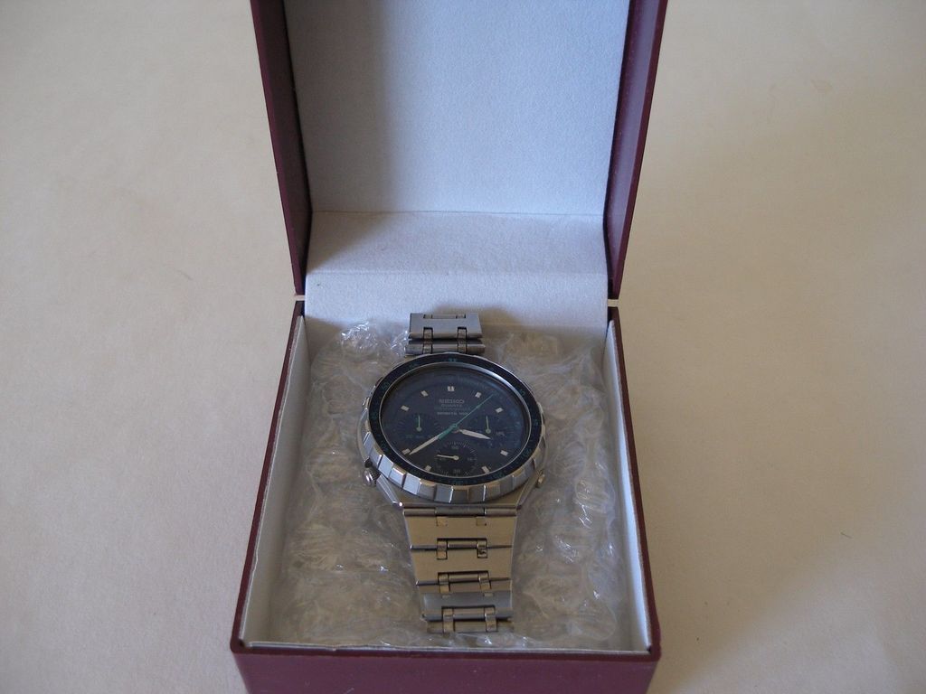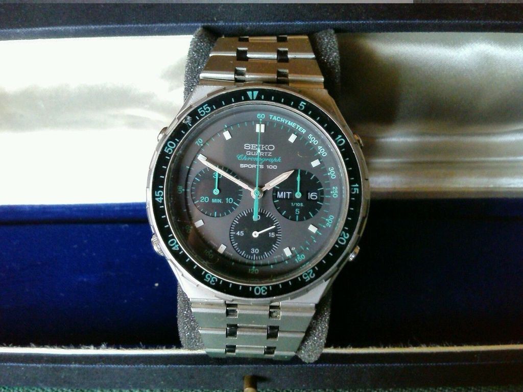 This auction is a very nice Seiko Quartz Chronograph Sports 100 (7A38-7050) Rotating bezel Seiko stainless steel bracelet Movement: Quartz Dimensions: approx. 40 mm Condition: very good condition Function: all right Original seiko box Everything works as it should | |