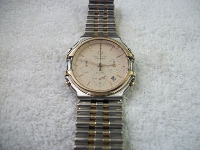 Jean Lassale Thalassa Chronograph This is a beautiful stainless and 14K mens Thalassa. Really nice shape. All functions work as they should. Quartz 7A74 movement, keeping accurate time. Recent leather band and deployment clasp.
