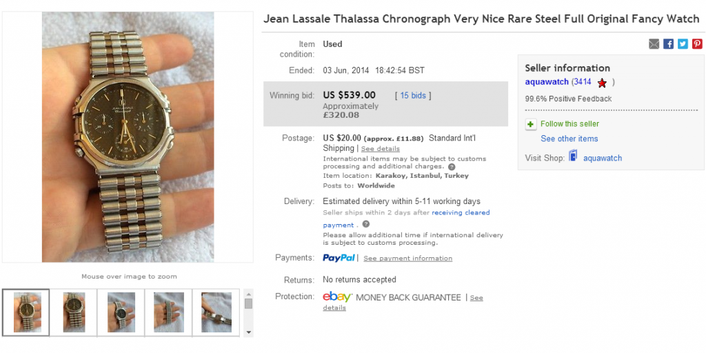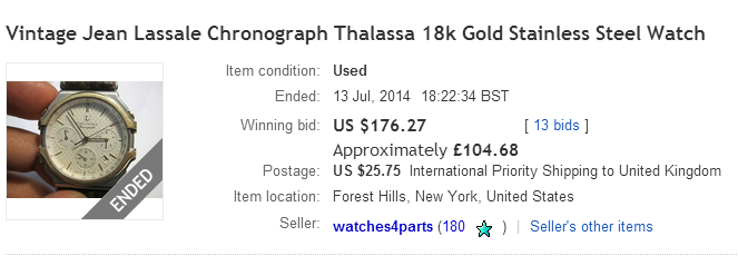 These next couple of posts are by way of a belated addenda - and to show that I'm not always as infallable as I'd have you believe. The original subject of this thread was my own all-stainless 7A74-017 Jean Lassale Thalassa and my strip down and fettling of it, but I'd kept it going by updating it with any new eBay listings or other advertisements I saw for them. Fairly religiously, or so I thought. I've been trading PM's with a forum member who's interested in acquiring a Thalassa 7A74. I recently wrote back to him: Yes the JL Thalassa's are nice - if something of an aquired taste. If you've read through the longer three page thread, then you'll have seen every 7A74 that I've seen myself over the last two years - my opinions on their condition and the prices they sold for. That last one on eBay Germany was nice - I quite fancied it myself, but couldn't justify the price. I suspect as the seller hasn't re-listed it, it may have been sold (off eBay), but it might be worth dropping him a message. The link that I posted to that ended auction is good - or it was at the time. The reason it doesn't work any more is that the German eBay seller kristian-uhrmacher-juwelier is no longer a registered eBay user. It's one of those annoying eBay foibles. Strangely, it's still there as an ended item on my eBay watching page, but if I click on it, I get the same error message. It was while I was browsing eBay history, trying to find that listing (and another way of re-linking it), I realized that I'd completely missed a couple of other Thalassa's on eBay recently. I know the reason too. I'd originally had three different eBay saved favourite searches set up to find them (when I was actively looking for one for myself). A while back, I did a bit of 'rationalization' - and probably selected the wrong one for deletion. I've since re-instated it, needless to say. Thinking about it - remember this bit ? It's nearly 9 months since I last updated this topic. There quite possibly have been other Jean Lassale Thalassa 7A74's listed and sold in the interim, but I personally haven't seen any - but then I hadn't run any Worldwide searches on eBay.com, until earlier this evening. Anyway, here they are (or should I say were): http://www.ebay.co.uk/itm//310960105242