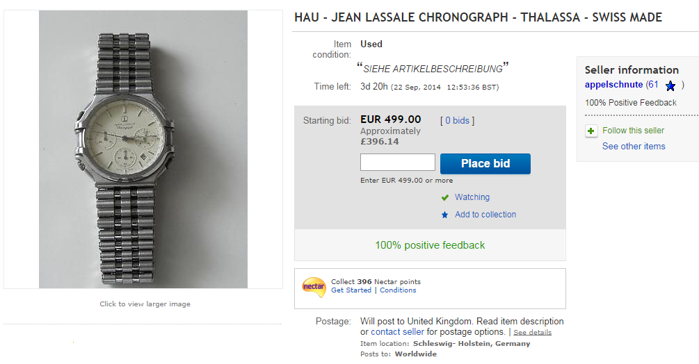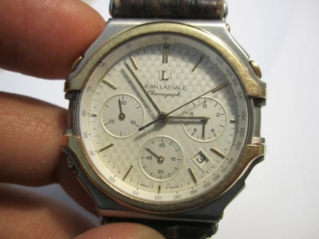 The 'gotcha' is in the seller's bi-lingual listing description - another missing pusher button. Herren Armbanduhr aus den 80er Jahren. Jean Lassale Chronograph, Thalassa. Gebrauchter, aber guter Zustand, sie funktioniert einwandfrei, ein Einstellknopf fehlt. Dieser ist sicher zu ersetzen. Leider habe ich von diesen Dingen keine Ahnung und weiß nicht was ein Sammler gerne wissen möchte. Fragen beantworte ich gern per Mail.