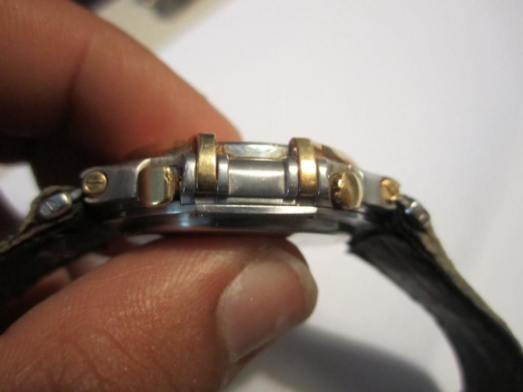 Case: stainless steel octagonal case Size: 38mm Glass: original glass Dial: black colour fancy dial Crown: original crown and buttons Strap: original steel bracelet Movement: quartz chronograph Working:full and good working As his photos tend to be rather similar and in the interests of page loading times, I've only uploaded 7 out of the seller's 12 photos. One thing is clear - that the crown fitted wasn't original; likely something he found in his bits box. Another 'anomoly' is the date wheel. With previous examples of 7A74-017 fitted with this black dial with gold batons and hands, the date wheel has been black numbering on a white background. Something IIRC, that I'd commented adversely about. I'm wondering if this 'variation' was original. ------------------------------------------------------------------------------------------------------------------------------------------------------------------------- The third one which was only a 3-day listing in mid-July, was another two-tone stainless / 18ct with that champagne coloured faux guilloché dial, but on a leather strap - in fact the same as the example I posted at the top of page two of this thread. But read on .... http://www.ebay.co.uk/itm/131238670850 PLEASE READ BEFORE BIDDING I work for a local watch repair shop, we service and repair all types of watches. Some of our customers decide not to repair their watch after the estimate is provided. A small percentage of those customers donate their watch for parts, but we rarely have a need for these. They usually end up sitting in a bin for years. All watches being sold are in non-working condition unless otherwise stated and should be used for spare parts or a restoration project. I am not a watch expert but will describe the watches and answer any questions to the best of my ability.