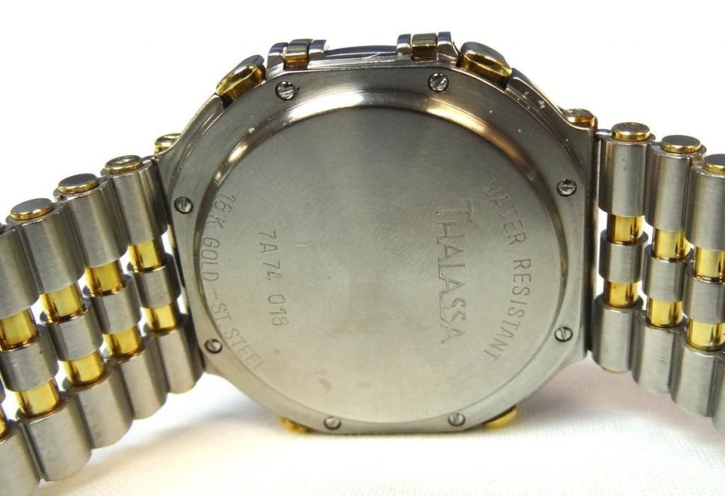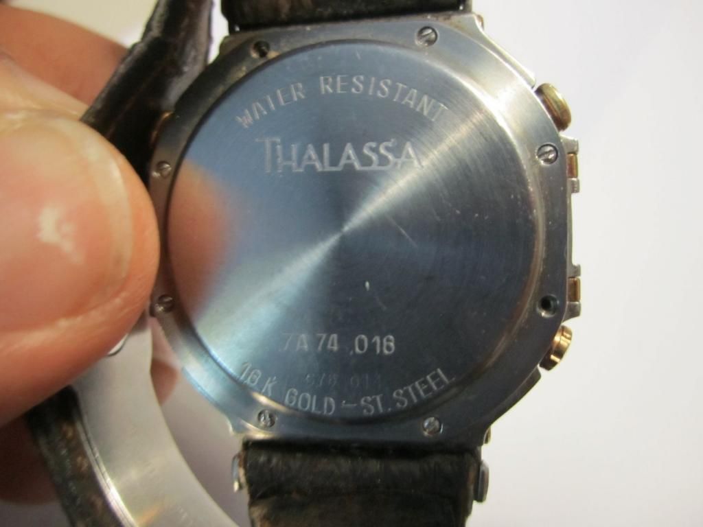Up for bid is a Vintage Jean Lassale Chronograph Thalassa 18k Gold Stainless Steel Watch. Watch is not running. I can pull out the crown and engage the hour and minute hand, and date. There are supposed to be 3 push buttons but as can be seen in the pictures there are only 2 and they push down fine. Watch is in decent shape some signs of wear taking in consideration the age of the watch. The band is also original to the watch its in used condition, but the clasp closes down fine. I would like to stress that these watches are being sold AS-IS. So, for $176 and change, someone got themselves a relatively cheap project watch - in Thalassa terms. OK, so it's a non-runner. The white sulphate deposits on the boss of the constant seconds hand are a pretty good indication of some serious battery acid damage lurking under the dial. The hour and minute hands are tarnished too, but will probably polish up. Any movement problems could easily be solved with a cheap 7A34 donor. Replacements for those couple of missing backplate screws shouldn't be that hard to find, either. But a missing 18ct pusher button ? - that's hen's teeth territory. Funny coincidence, given the timing of Radsport's post - a matter of two weeks after this listing ended. Call me cynical if you like. | |