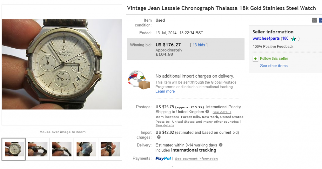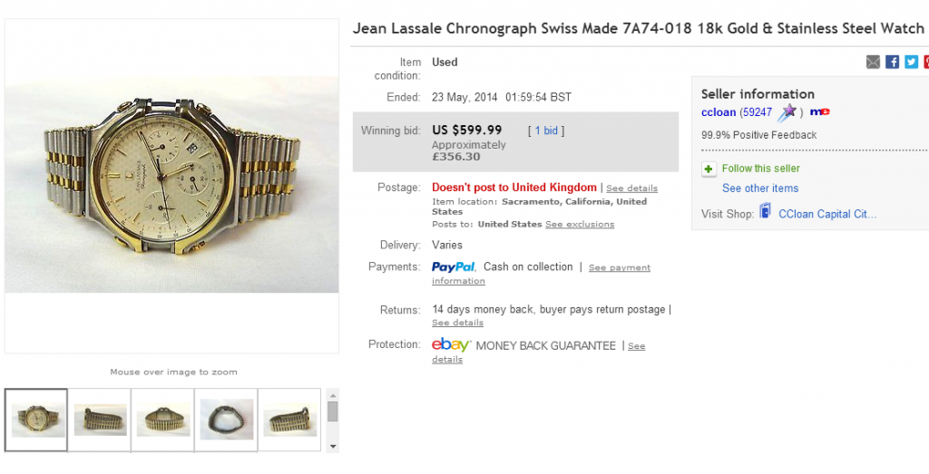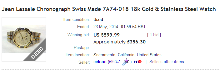 Not entirely a surprise, given the lacklustre photos, and even poorer listing - it didn't sell first time around. It was re-listed earlier today: http://www.ebay.co.uk/itm/231020772971 At least, this time, he's managed to spell Lassale correctly (if not Chronograph), but the model number, which should be 7A74-017 is still wrong in both his subtitle and description. There's also a 'Make Best Offer' button this time around, which may add some interest. | |