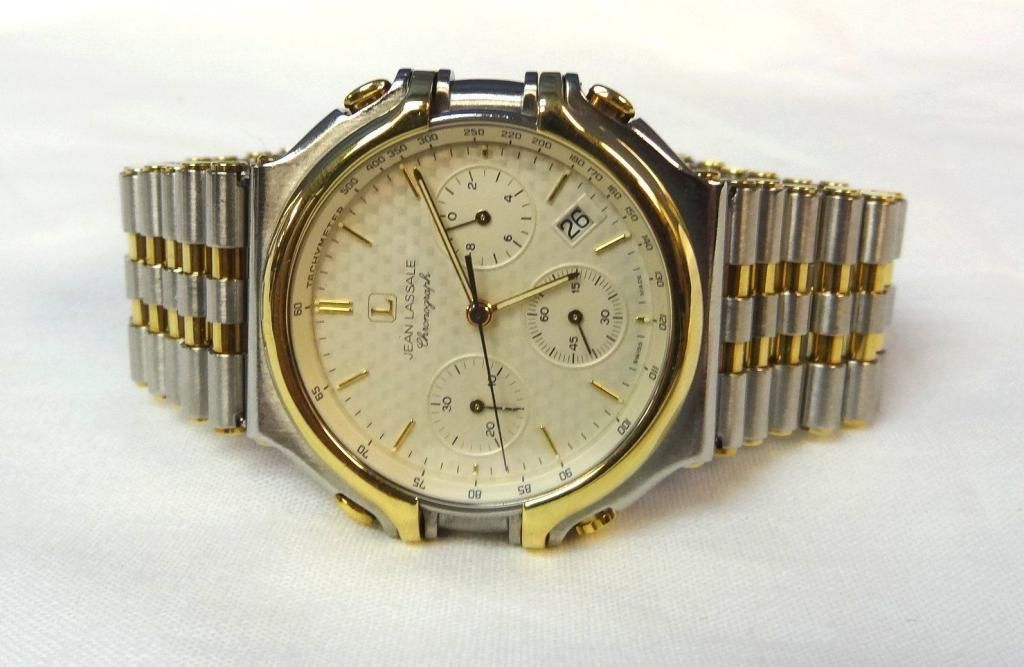 Hersteller: Jean Lassale Werk : Quarz Funktionen: Stunden, Minuten, Sekunde, Datum, Chronograph Armband: Stahl/Gold 14k Gehäuse: Stahl/Gold 14k Glas: Saphir Durchmesser : (ohne Krone) 38mm Die Uhr wird mit Box und Papieren geliefert Zustand: guter Zustand funktioniert einwandfrei 12 Monate Garantie