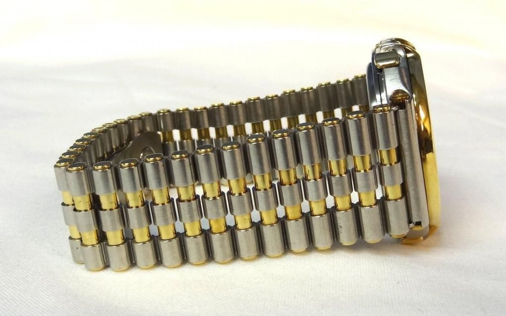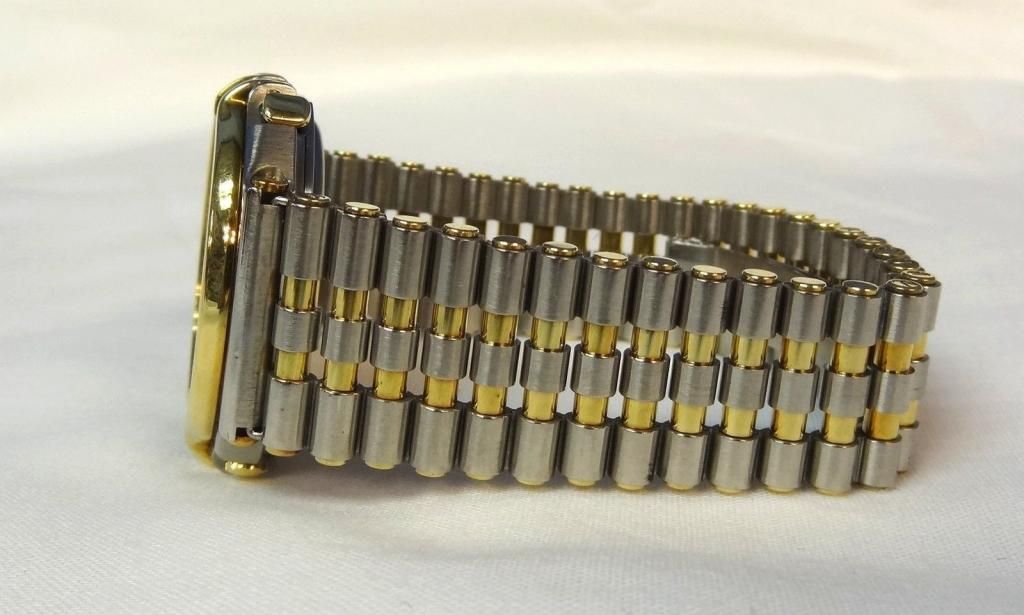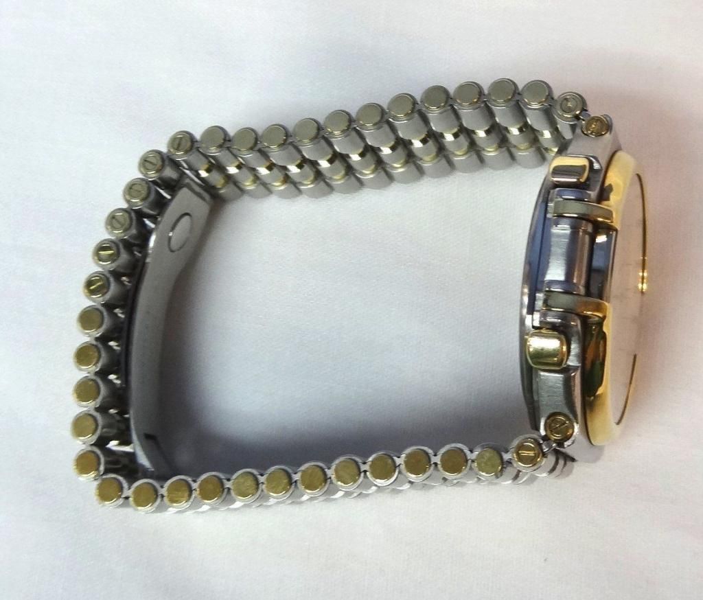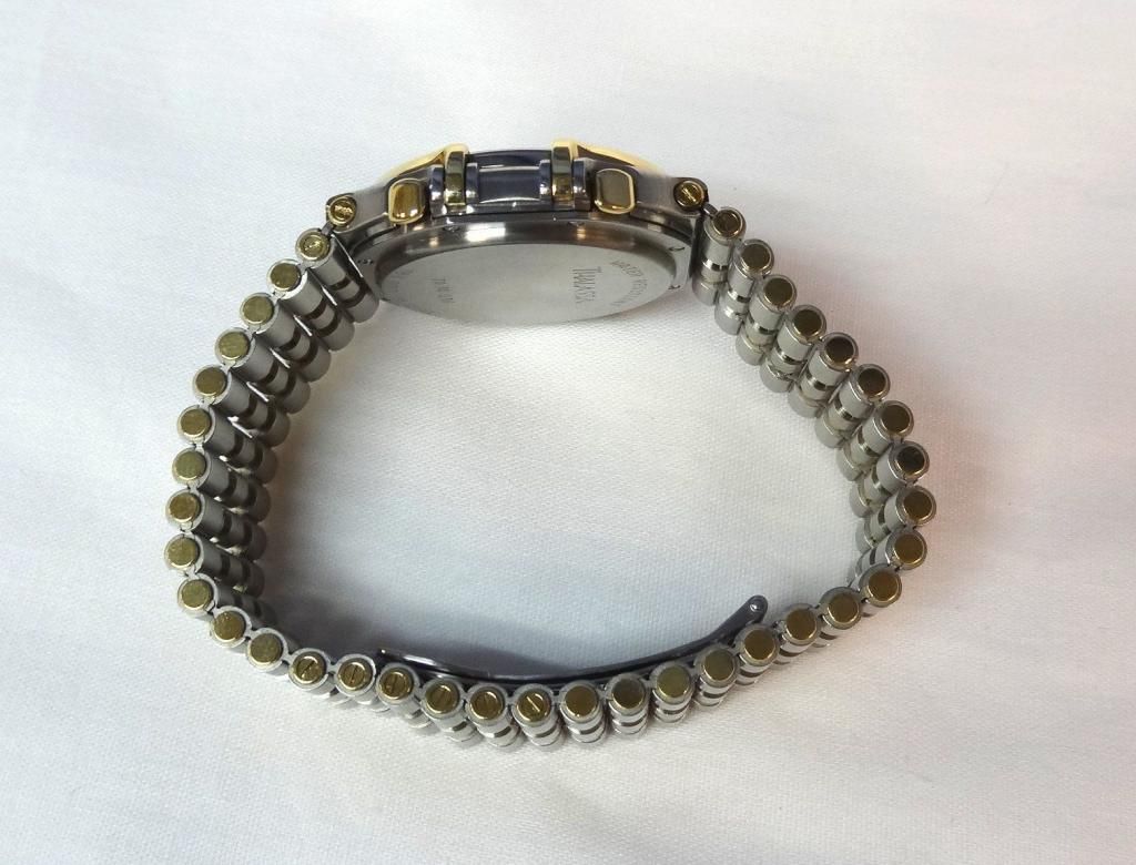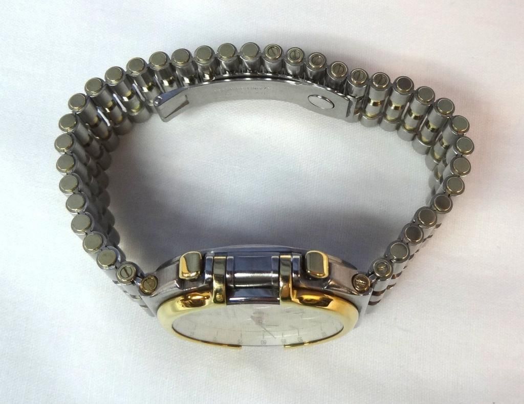 Two tone stainless and gold (though the seller's description states it's 14k rather than 18k); white dial; 'Swiss Made' and push-button butterfly clasp. Doesn't look like it's been polished either - a refreshing change. Oh well, perhaps the asking price may come down. | |