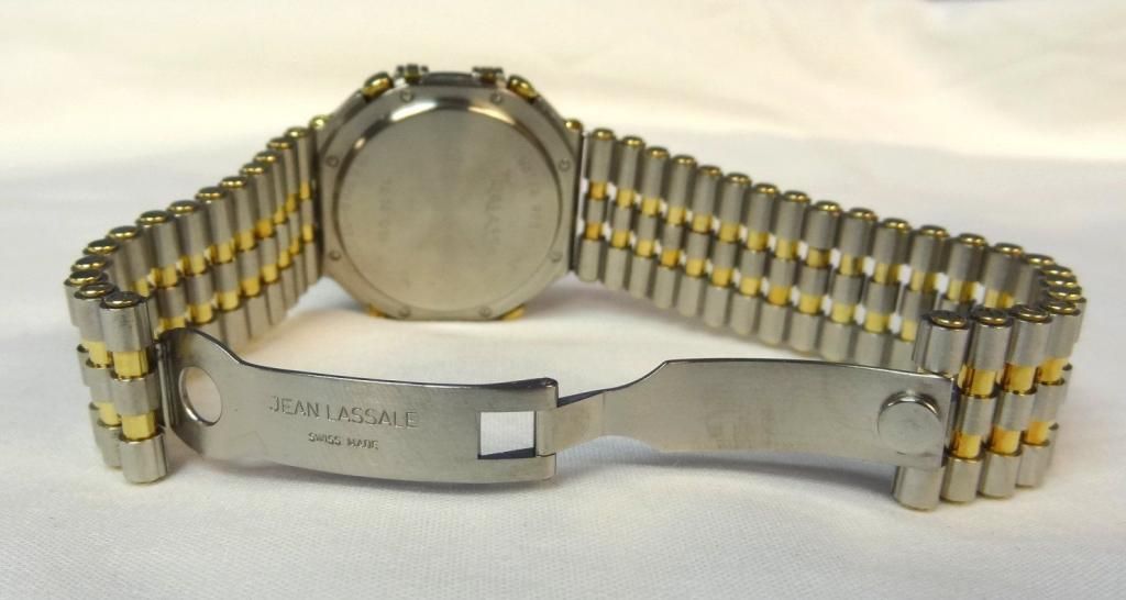Offered for is this Excellent Vtg ( 1980's ) Jean Lassale 18K Solid Gold & Stainless Steel Original Chronograph Watch. This Beautiful Classic Gentleman's Watch comes from an estate of Fine Vintage Watches & Great Old Pocket Watches. This Jean Lassale 15 Jewel Quartz Watch comes complete with a Fresh Battery, and has run right on time for several days. This Watch Features a Heavy Port Hole Style 18k Solid yellow gold Bezel with 18k Gold pushers & crown. All functions are working, and this watch is ready to wear. The Case & Bracelet are ding & scratch free, plus is super clean, free of any soiling. The back still has the Original plastic seal in place. The Bracelet and Watch combined are a little over 8" as my wrist is 8" and would need at least one link removed for fitting. We don't have the Original Box or papers as we just overlooked it at this Huge Estate of watches. This Watch WILL get the attention deserved when packaging. Christmas is FAST approaching, so do consider this a Wonderful Gift Idea .... ------------------------------------------------------------------------------------------------------------------------------------------------------------------------- Belated Edit: There's something fishy going on with this one. The following day, October 30th, the seller listed the same 7A74-018 (same photos, same description) as a low start (US $0.99) 7-day auction - in parallel with the existing 10-day Buy-it-Now listing. http://www.ebay.co.uk/itm/271651625113 The photos may be in a different order, but the case-back serial number shown S58 151 is the same. I'm not sure of the legitimacy of such duplicate listings (as far as eBay rules are concerned), but their ethics suck. Especially when the seller has cr*p like We do wish everyone the Best of God's Blessings in both their listings. Bloody hypocrites ! ------------------------------------------------------------------------------------------------------------------------------------------------------------------------- Final Post-script: That (second) auction listing ended with the 7A74-018 selling for $750 (approx. £473.39) after 21 bids. Not a bad price for one of these. http://www.ebay.co.uk/itm/271651625113 The seller duly ended the original Buy-it-Now listing a couple of hours later - quite possibly rueing his decision. http://www.ebay.co.uk/itm/281481010603