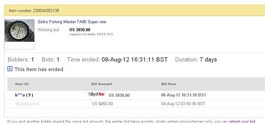 In fact, over 12 months later, that auction is still in eBay history: http://cgi.ebay.co.uk/itm/160611850106 - but the photos are all gone. Skip (a.k.a. Taxking1 / Watchking1) was the winning bidder. I should have gone for it myself - or referred it to another 7A48 collector. You see, as mentioned in another thread, much to my disgust, I soon learned that Skip isn't what I'd really class as a watch collector .... He's just another habitual serial flipper with an eye for a fast buck. There are other threads on RLT which mention the 7A48-7050 Fishing Master, like this one entitled Must Get Seikos .... http://www.thewatchforum.co.uk/index.php?showtopic=68828 See Skip's post #27: http://www.thewatchforum.co.uk/index.php?showtopic=68828&view=findpost&p=692688 Seiko Fishing Master. I don't wear it much because I have the white dial/hands syndrome but still very nice indeed. and my post # 39: http://www.thewatchforum.co.uk/index.php?showtopic=68828&view=findpost&p=693082 (bottom of the quote) So, after harping on about wanting this 'Grail' for so long, he turned around and flipped it only 2 months later (using same photos) ! See: http://www.ebay.com/itm/190577706738 Seiko 7A48-7050 Fishing Master Moonphase Vintage Very Rare All Original Excellent Original Condition Seiko Bracelet Full size