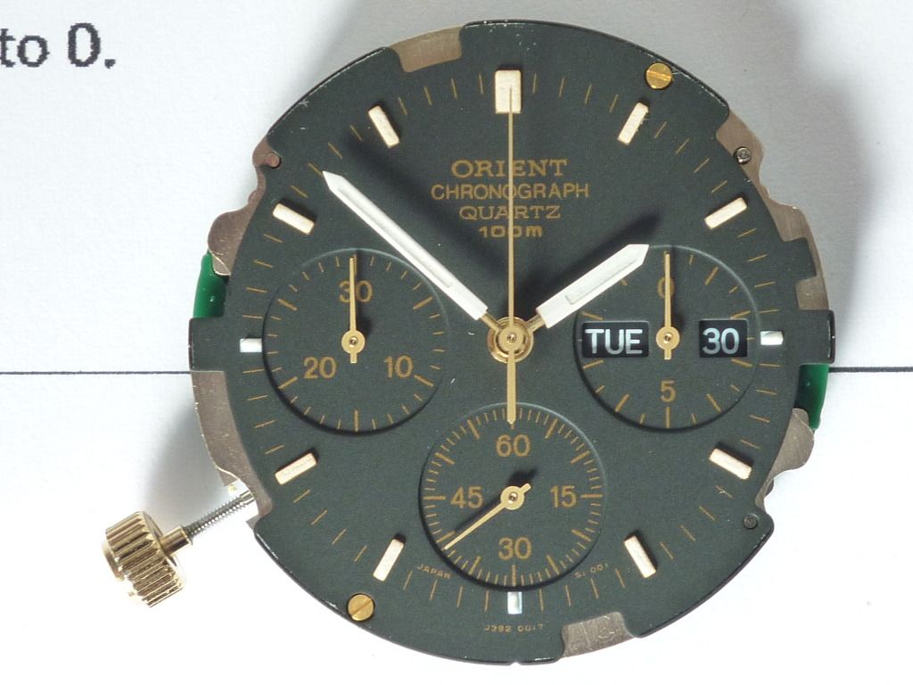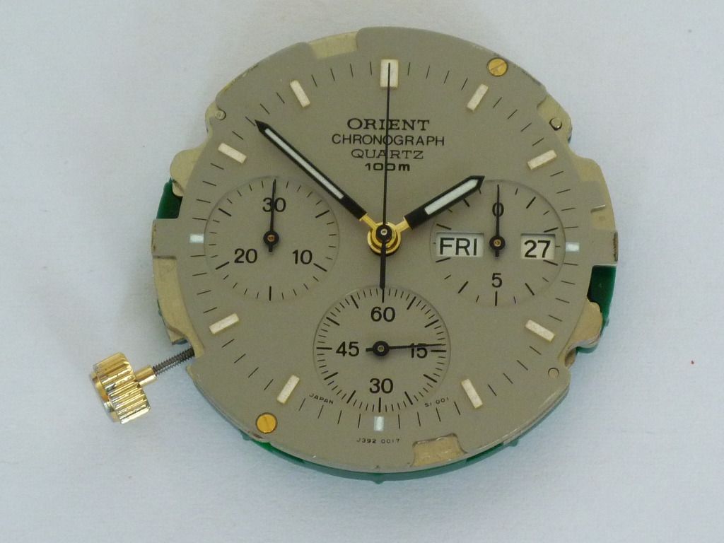 It's in a job lot of 8 watches and the seller's crappy photos are only 640 x 480. That's a 2x zoom and crop from the best of three. It's described simply as Orient chronograph, but it's clearly a 7A38 (J39) and the gold plated bezel with moulded Tachymeter scale looks the same as that of the Puma Y19904-50. The bracelet is likely an after-market fitment and something doesn't look quite right with the 30 minute sub-dial. Needless to say I'll be following up in due course - hopefully with a better photo of just that watch .... | |