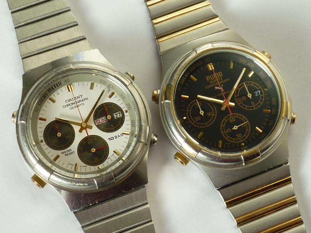 Per my earlier statement (of over a year ago): Of course 'we' already knew that the Puma 7A38's were made by Orient - there are so many similarities and shared common parts. I hadn't posted this photo on our forum before, only previously on RLT in the Puma 7A38 .... By Orient thread (29 November 2011). Seeing as I'd used it to illustrate a point in another Orient-related topic, earlier this week, I thought I may as well add it on here too. My post in that thread included: Anyway, here's a side-by-side photo of my latest Orient J39725-70 'beater' with my original 'stainless' Puma Y19001-70 .... To further reinforce the (now completely obvious) Orient / Puma connection .... Case (now completely) proven I believe, M'Lud. | |