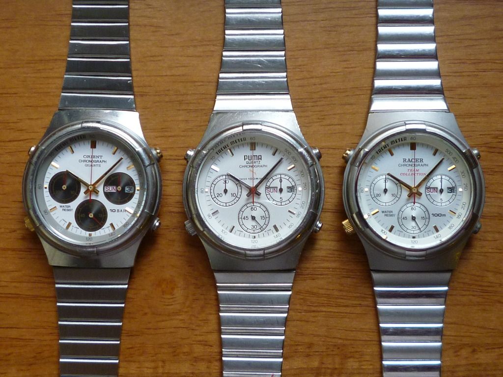 Left to Right: Orient J39725-70 (on Feiko aftermarket bracelet), Puma Y19301-70 and my newly acquired Racer J39710-70. | |