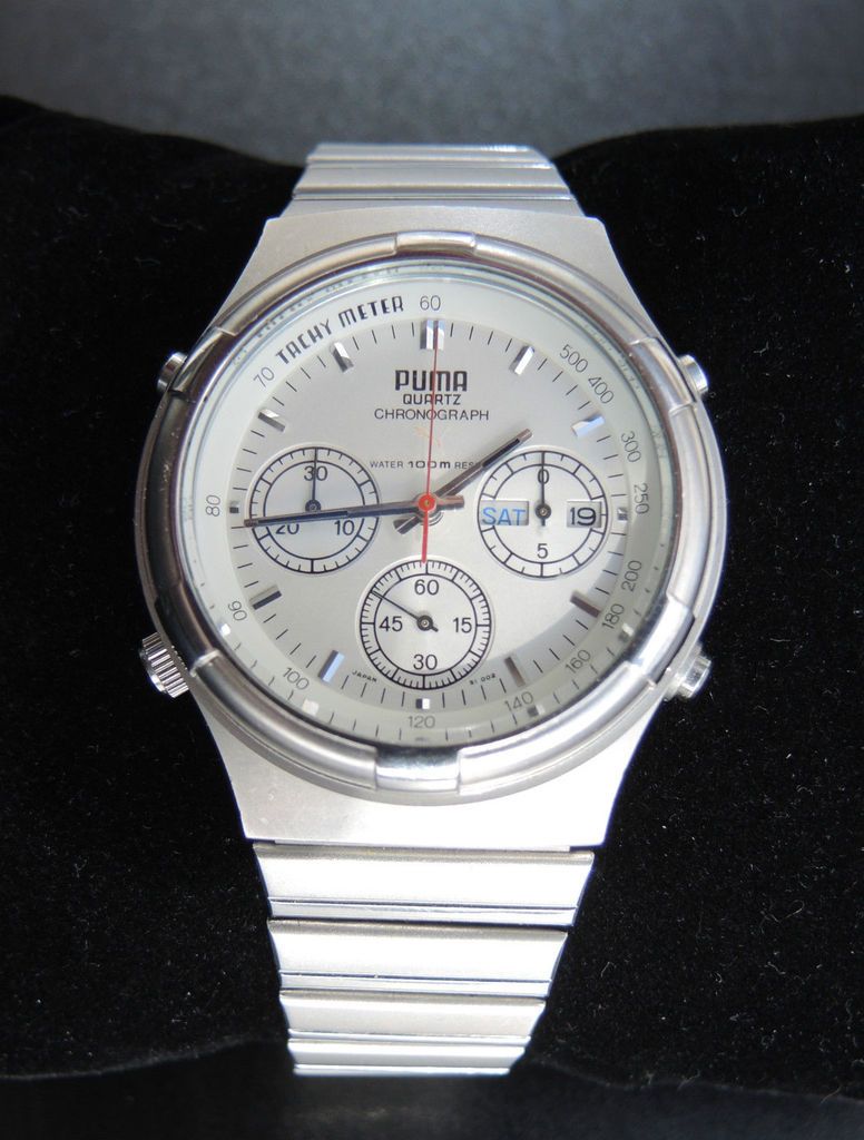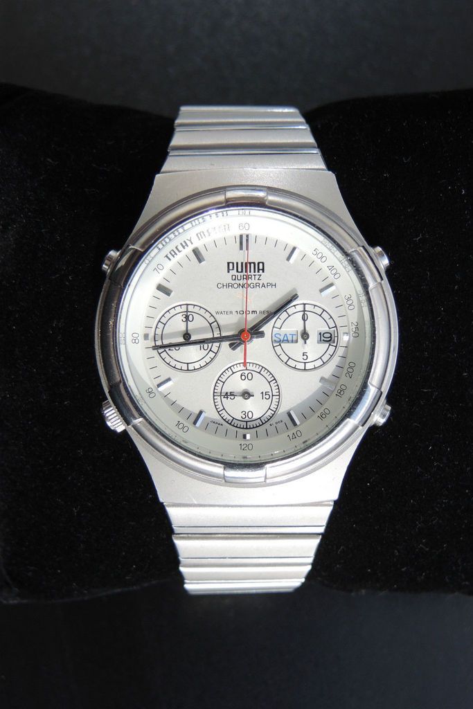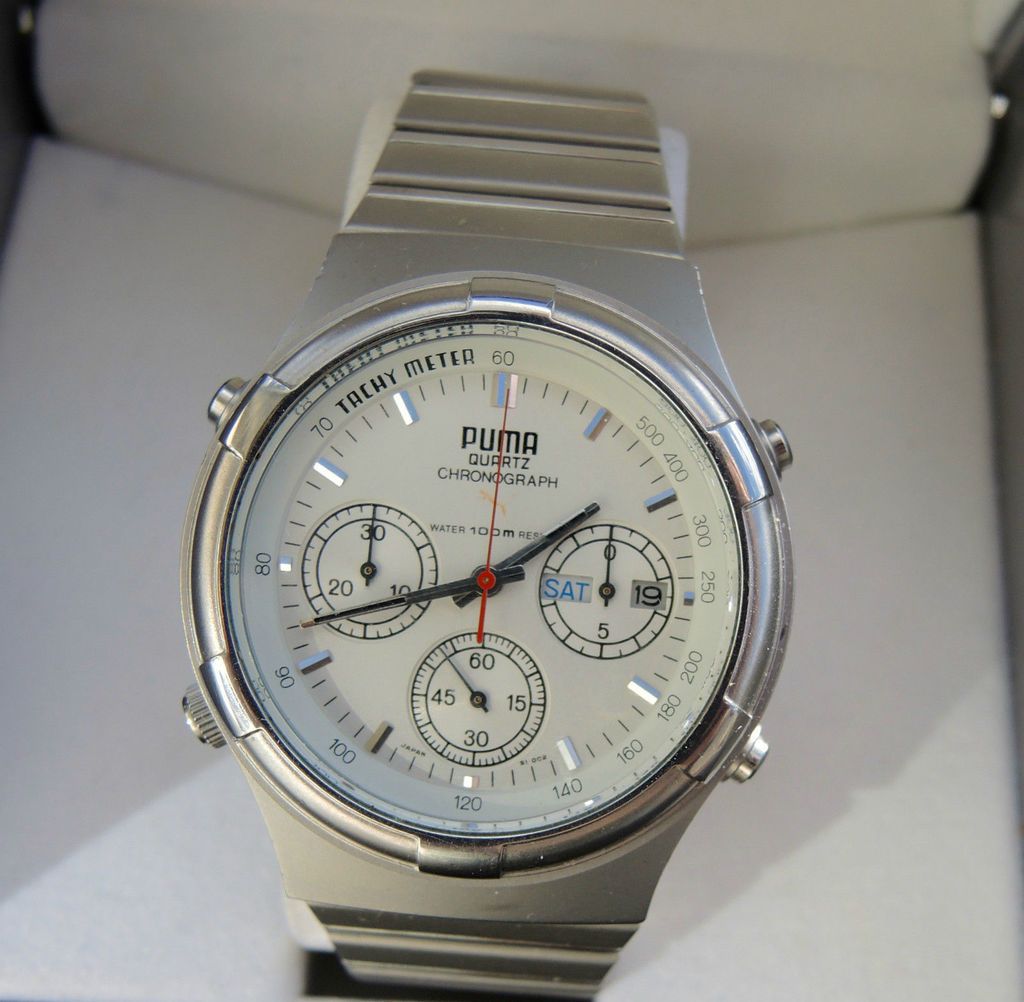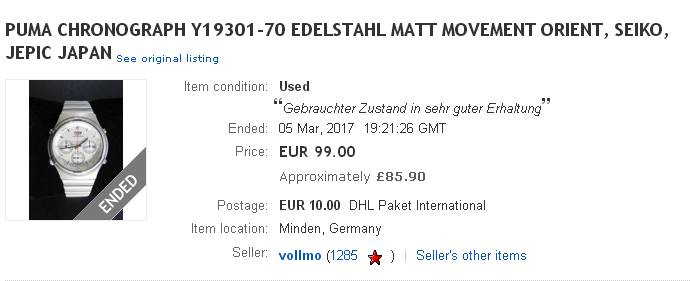 PUMA CHRONOGRAPH Y19301-70 SI 002 Sehr gut erhaltener Chronograph in mattiertem. Edelstahlgehäuse mit Originalarmband mit Faltschließe. Die Uhr wurde kaum getragen, daher Glas ohne Kratzer und die Mattierung nur mit minimalen Gebrauchsspuren. Batterie neu. Dies ist ein privates Angebot ohne. Garantie und Rücknahme. It appeared to be a particularly nice example, with minimal wear. It was listed at peak time on Sunday evening and I can only assume from the low number of views the listing received (20), must have sold pretty quickly for the 99 Euros Buy-it-Now price. http://www.ebay.co.uk/itm/132116286752