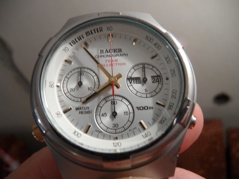 Something I hadn't previously mentioned (at least not in this particular thread) was the three-way connection between Puma, Orient and its subsidiary Spanish brand RACER. Unlike the Puma branded watches, Orient Watch Co. Ltd. made no attempt to hide their involvement in their manufacture; the dials may have carried the RACER logo, but their case-backs are stamped ORIENT. Perversely, the white-dialed Racer equivalent of the Orient J39 and Puma Y19's, the J39710-70, which is predominantly all stainless, has the gold plated batons and hands I'd have expected to see in the above Puma Y19201-70 variant.