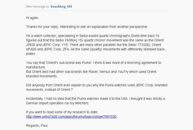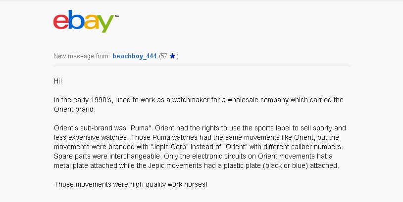 Well almost. Feeling a bit miffed that the link on the Irish Patents Office website to the Puma / Orient / Jepic Corporation licensing agreement had conveniently been removed (as incidentally had the other link I posted, dating back to 1981), I couldn't resist googling Orient / Jepic Corp. one more time. I did find something comparatively new, though not from an official source, as such. I came across a cached google result on eBay Italy of all places, which lead me to this .... An eBay (re)listing for a job lot of 21 NOS Orient / JEPIC Corp. quartz movements from May 2015 by a US eBay seller. http://www.ebay.co.uk/itm/321751021126 The (unsold) lot didn't include any Y19 movements unfortunately. However, intrigued as to how he might have made the Orient / Jepic Corp. connection, I messaged the eBay seller. He replied: