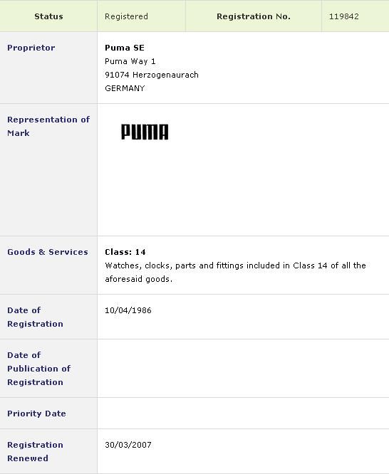 I'm not sure of the date (possibly 12/04/1999, per that Irish Patent Office link) but Orient Watch Co.'s licencing agreement with Puma has long since expired. The current licensee is the Swiss Marlox group: http://www.marloxgroup.com/content/puma-time They may be 'Swiss' but most of the cheap plastic fashion tat they produce for Puma is clearly made in China. | |