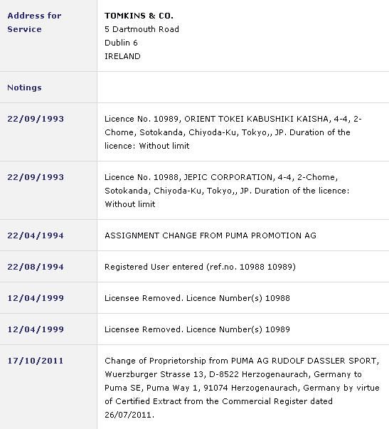 The timing of Orient's re-registration of the Puma trademark was far more probably connected with Puma's company name change from Puma AG to Puma SE, when they became a public company in 1986. See: http://en.wikipedia.org/wiki/Puma_SE Some of the dates shown in that Irish Patents Office link obviously lead to my earlier confusion.
