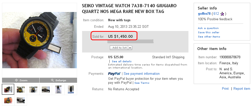 SPLENDIDO SEIKO CHRONOGRAPH SPORTS 100 NUOVO FONDO DI MAGAZZINO. FANTASTICO! SPETTACOLARE QUADRANTE BICOLORE GIALLO E NERO CON LANCETTE CRONOGRAFICHE IN COLORE ROSSO. LA CASSA, HA UN DIAMETRO DI BEN 41 MM ESCLUSO PULSANTI E CORONA. IL FONDELLO, AVVITATO, RIPORTA OLTRE AL LOGO DELLA MAISON LA REFERNZA DELL'OROLOGIO 7A38-7140 E LA MATRICOLA 580088 IL MOVIMENTO AL QUARZO E' IL CAL. 7A38 PROVVISTO DI DATA E GIORNO. BRACCIALE IN ACCIAIO VERNICIATO PVD. VETRO ZAFFIRO. COMPLETA QUESTO BELLISSIMO OROLOGIO IL SUO ASTUCCIO CON SCATOLA DI PROTEZIONE E LA GARANZIA ANCORA IN BIANCO. UN RARO OROLOGIO DAL DESIGN ACCATTIVANTE, FRUTTO DELLA FELICE COLLABORAZIONE TRA SEIKO E IL FAMOSO DESIGNER GIORGETTO GIUGIARO. SONO A VOSTRA DISPOSIZIONE PER QUALSIASI ULTERIORE CHIARIMENTO O FOTO. NON ESITATE A CONTATTARMI. BUONA ASTA! The eBay auction ended on 8th August 2011, with the watch theoretically selling for 253 Euros after 13 bids. However, it seems that the seller did not honour the sale, and less than two weeks later, it re-appeared on eBay Italy classifieds .... But now with an asking price of 380 Euros. That advert has long since disappeared: But the post on Orologi & Passioni (by the disgruntled winning bidder) still remains for all to see: http://orologi.forumfree.it/?t=56761653&st=30#entry467542725