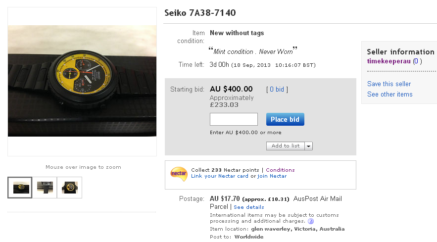 So what could the watch have made, had the listing been allowed to run the full 10 days ? Would the auction possibly have ended in a last 10 second snipe-fest that might have pushed the price up another £50 - let alone £300+ more, to match the kind of stupid price currently being asked by Kineticsinc2012 for his example ? Somehow I doubt it.