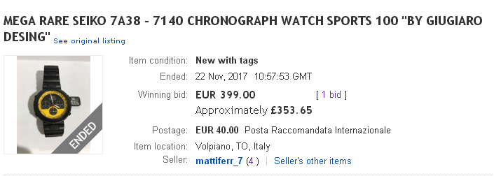 As revealed by WatchCount.com's Look-up tool, it sold for a best offer of 230 Euros: