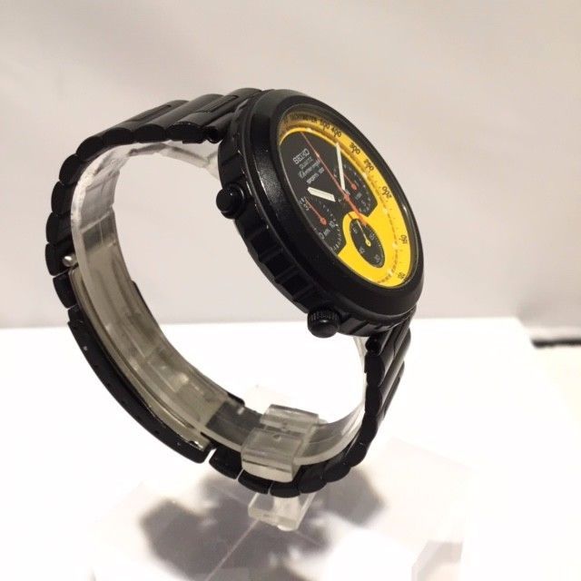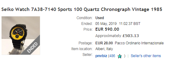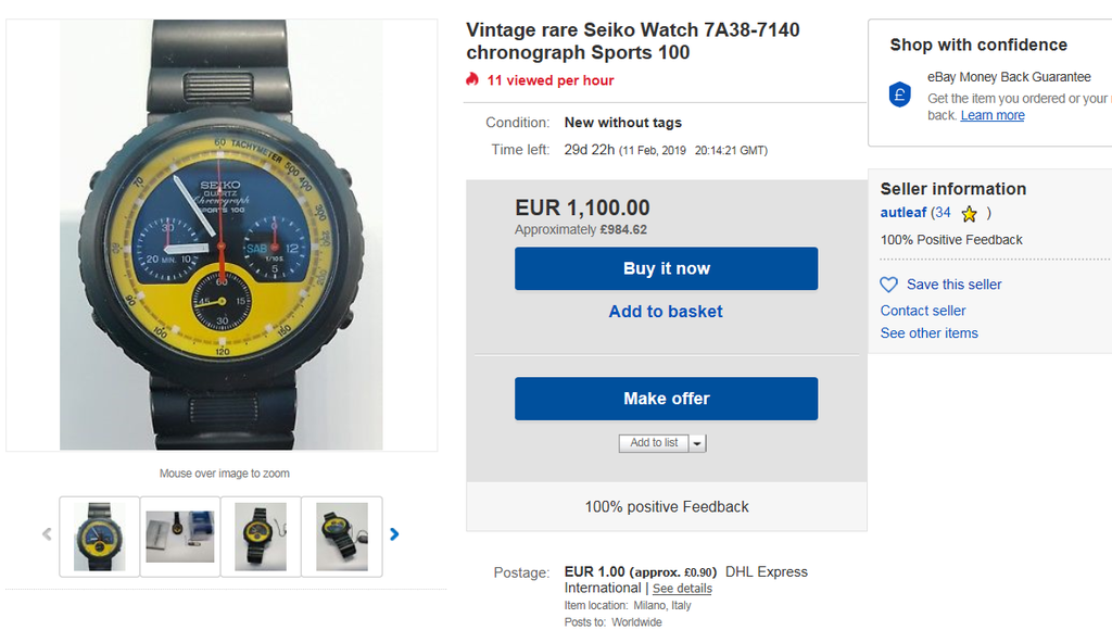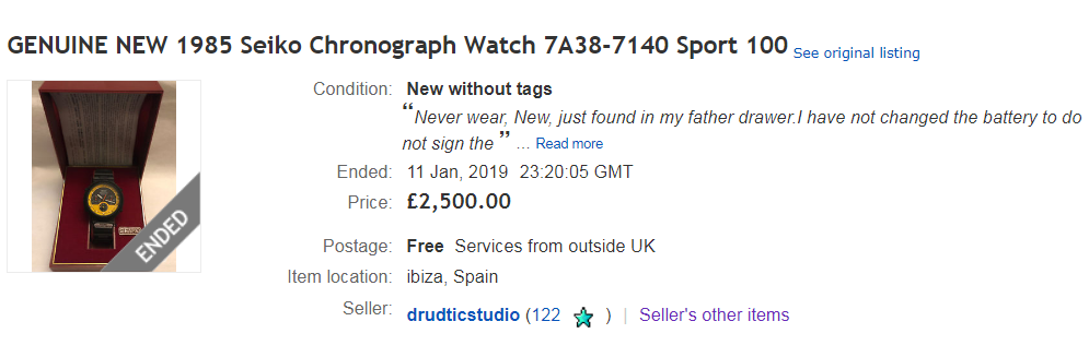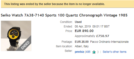 Translating his description, the Italian seller 'Lorenzo' claims .... I give spectacular and original SEIKO CHRONOGRAPH SPORTS 100 black with yellow dial .. clock from 1984-85 so now an absolute rarity and in conditions of nos .. it was 35 years in the jeweler's safe ... new battery and reverified all the circuit for a perfect functioning in all its functions .. unfortunately without a lost box from the former dealer ... I can consider exchanges, even higher prices, but only with sub watches, Seiko or anyway watches to my liking, but NO ABSOLUTELY to vintage . For exchanges only with delivery by hand. The price is not very negotiable and I do not consider offers too low or ridiculous .... Given the recent hike in prices perhaps I should consider keeping mine in a safe. His primary image is of my 7A38-7140 - stolen from page 1 of this thread !!