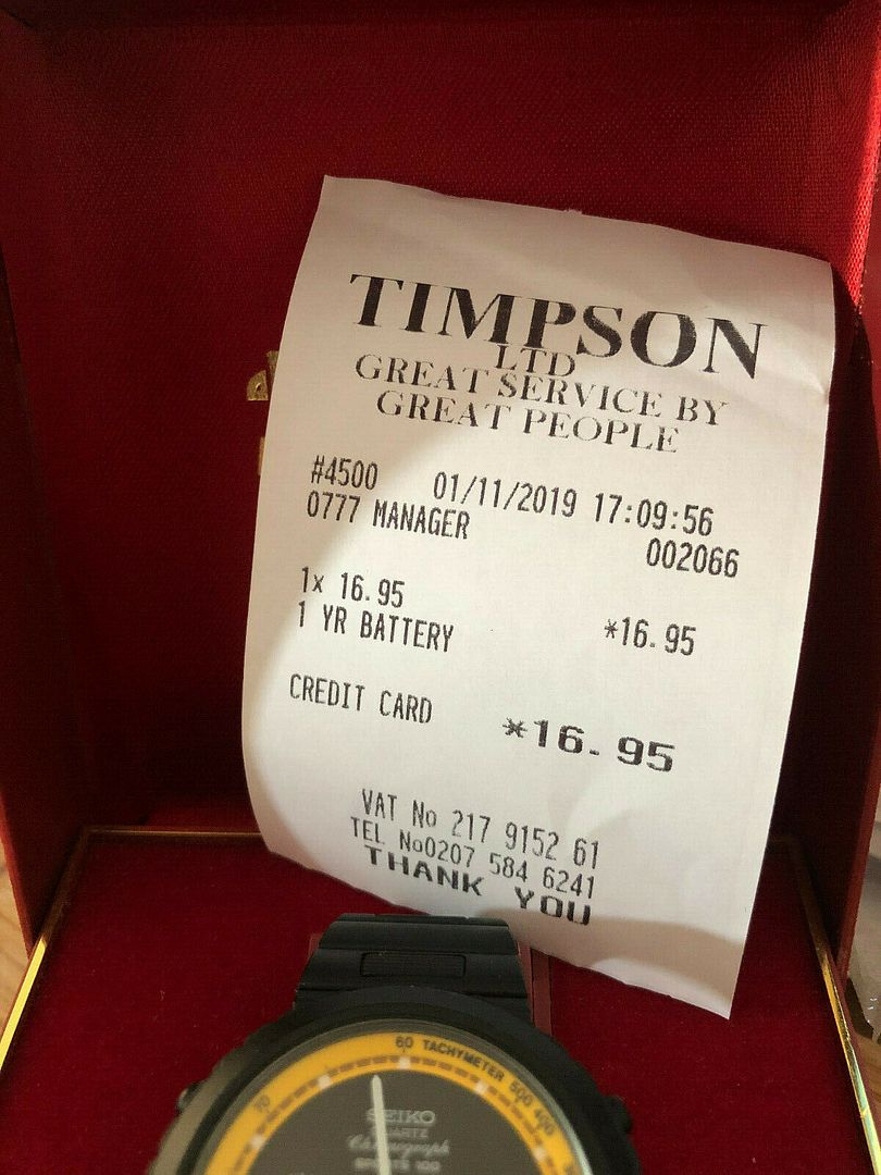 GENUINE VINTAGE Seiko Chronograph Watch 7A38-7140 Sport 100 CONDITION: Never wear, New with documents and tags. Battery has been replaced in Nov 2019. Timpson receipt in picture. SHIPPING: Ship Worldwide. Free tracked shipping to EUROPE Country and UK Included. The majority of the photos are the same used in his first re-listing in January, apart obviously from the one with the dated receipt. IIRC, the reason he hadn't had the battery replaced before, was that he didn't want to risk marking the case-back. So where did he take it to have it done ? Timpsons !! | |