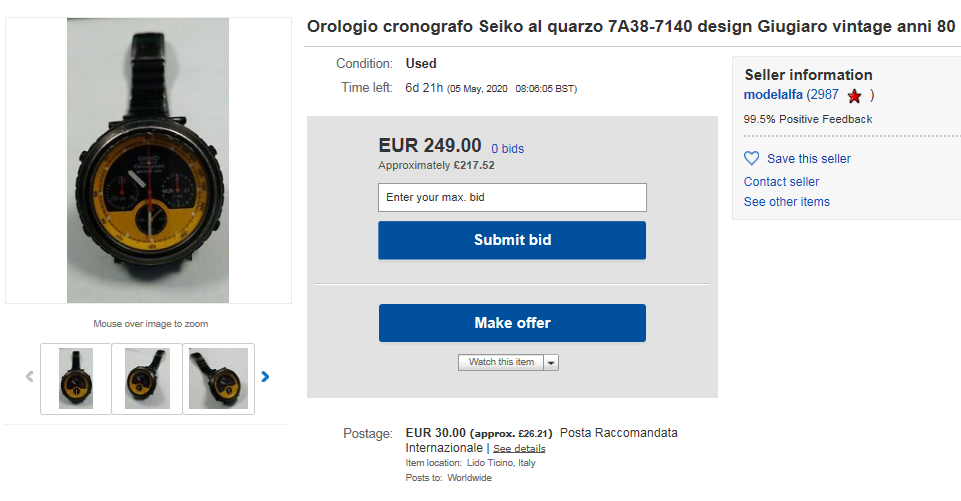 Some watches take rather longer to sell than they should - for the simple reason that they're stupidly speculatively over-priced for their condition. Case in point - that well-worn 7A38-7140 first listed by the deluded Italian eBay seller cima9132 last October, with a risible 'pie-in-the-sky' Buy-it-Now price of 899 Euros. The original listing had ended in December last year, presumably after a cycle of 3 x 30-day listings. The seller duly re-listed it. I just added the re-listing to my eBay watching page and thought no more of it. However, it transpires the seller had made a few revisions to the re-listing over the last couple of months: