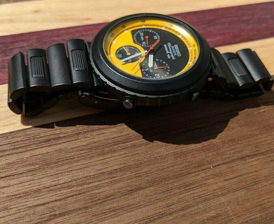 Seiko 7A38-7140 vintage quartz chronograph, from 1985. This is the first ever quartz chronograph with a date indicator. This version was only sold in Italy. It's running great, with all functions working. It features the famed foudroyante 1/10s second hand which counts off 1/10s. It's great fun to watch. After 10 minutes, the 1/10s hand switches to power saving mode, and only shows its count when stopped. The day wheel is Italian / English. This one was serviced and re-coated by a previous owner. The new black PVD coating on the bracelet and case is a modern very durable coating and it was very well done. If you actually want to wear your watch, consider this a plus. The original coatings are notoriously fragile. Watches with the original coating intact are very expensive, and wearing them you risk damaging them because they're so fragile. This one has the original look with a durable finish, so you can wear it. If you're all about originality, it's not for you though. It's in great shape and runs perfectly. The bracelet contains all 5 extension links (which is rare). I'll miss this one, but I have to sell to save for an Omega Contact me with questions. Water resistance not tested. See my other auctions for more cool watches. I combine shipping! | |