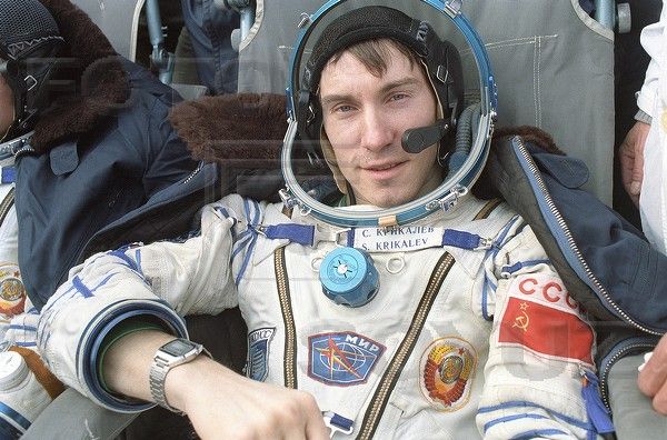 This particular image came courtesy of fyeahcosmonauts.tumblr.com but is © www.fotosoyuz.ru Anybody fancy a caption contest ? Joking aside for the moment, that Soyuz TM-7 post recovery image intrigued me, because not only did it show Sergei Krikalev from a different angle than those on the previous page, but that he appears to be wearing 3 watches (unlike aboard Mir, when he mostly chose to go bare-wristed). On his right wrist he's wearing an Elektronika-5 LCD digital (like Volkov's); on the middle of his left forearm (over his suit) is the tan leather strap of the Poljot 3133 chronograph which he wore at the launch (clearly visible on the gantry stairs) .... but on his left wrist is what appears to be a large stainless watch, with a blue dial on a black nylon strap. Sounds vaguely familiar ? So I ran a search on www.fotosoyuz.ru - to see what else I could find. I came across a close-up of Krikalev taken from the other side: