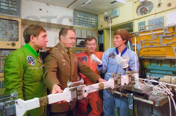 But the wrong wrist ! Another tantalizing image, again taken by the legendary TASS news agency photographer Albert Pushkarev on www.fotosoyuz.ru shows the Soyuz TM-7 primary crew members during training at Star City in 1988. The instructor is GCTC chief Vladimir Shatalov.
