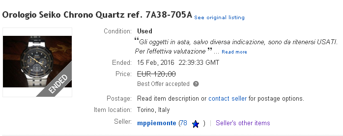 There was only the one photo and no proper description as such, just the Seller's Notes in the Item Specifics box, which translate as: Objects in auction, unless otherwise stated, are to be considered USED. For the effective evaluation of the condition of the object at auction are authentic photographs, so do not hesitate to ask for more if you are unsure. Needless to say, I didn't hesitate to hit the Buy-it-Now button. Don't think I've moved quite so quickly in a long time. Although I didn't waste a second researching him before I hit the button, it turns out that the seller: Metalli Preziosi Piemonte SRL is a Brick and Mortar establishment in Turin, dealing in watches, jewellery and precious metals: http://www.metallipreziosipiemonte.com/ | |