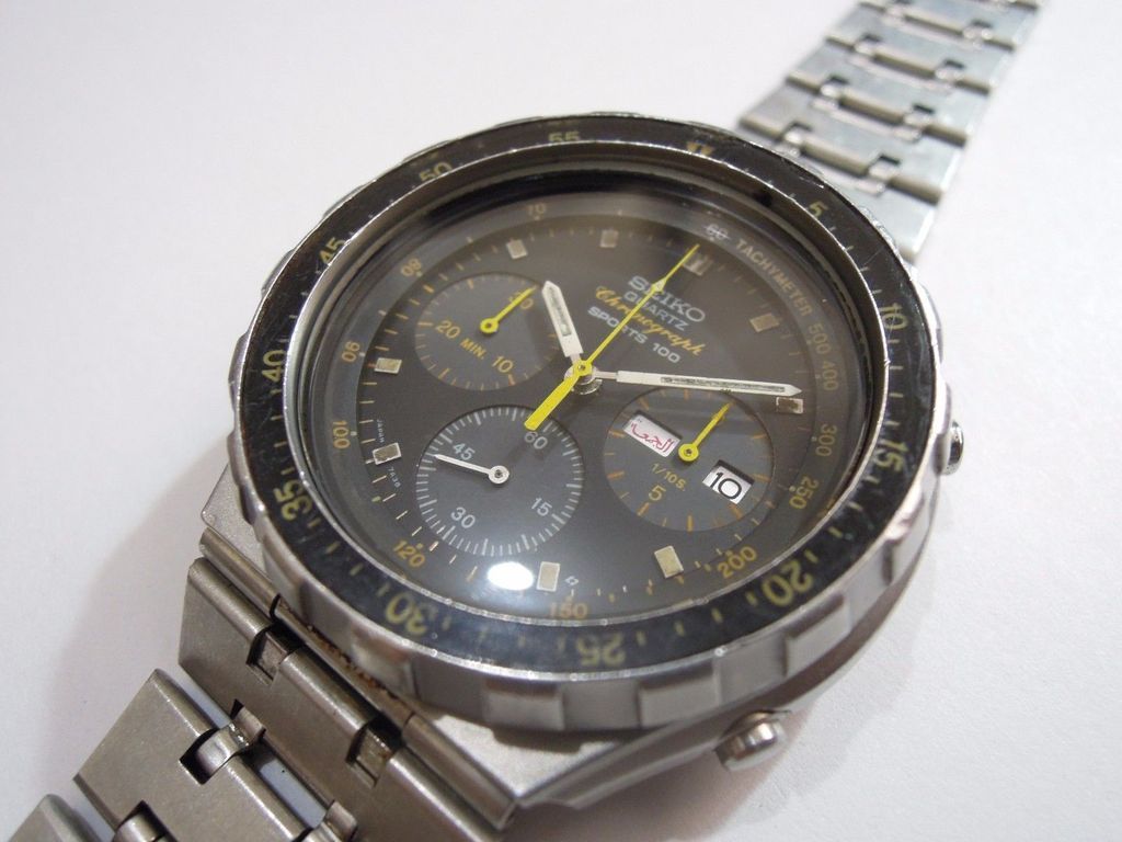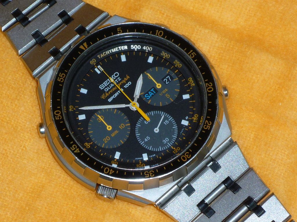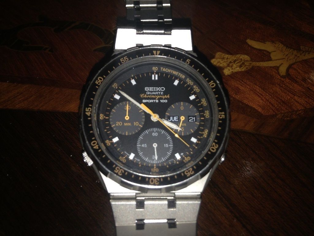 (SÅLD!) Cool och rejäl Seiko 7a38-705a från -84. Dessa ska tydligen vara bland de första analoga quartzkronograferna som gjordes! Just denna är hyfsat ovanlig med sitt lite råare utseende, vridbar klickande bezel och gula/blekt orangea inslag. Ca 41 mm i diameter exkl. krona och knappar. Allt fungerar bra, och håller tiden snudd på perfekt. Nya packningar och trycktestad, för några dagar sedan. Patina och bruksspår finns lite här och där, men inget som jag tycker stör på en sån här toolis (SÅLD!) Önskar 1500 kr + valfri frakt