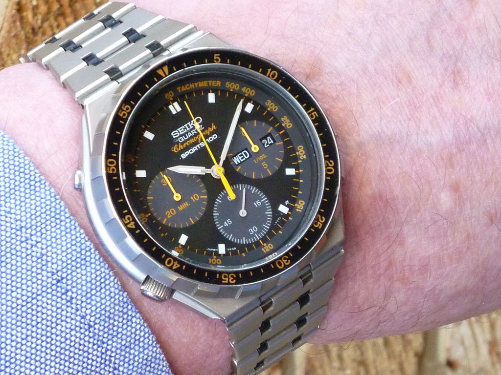 The only minor problem with it that I've noticed (other than some light 'Desk Diver' marks on the clasp) is that the 4 o'clock pusher button is inoperable. It depresses, but doesn't travel very far, nor do anything. Hence why I wan't able to zero the chronograph sweep second hand, before I took these photos. Not unusual with this case design. I've experienced similar problems with a 7A38-7050 in the past. Their pusher operation is never particularly positive, even at the best of times. I'll take a few more photos at the weekend, once I've sorted it and given the watch a light clean. Here's the obligatory Q&D wrist shot: