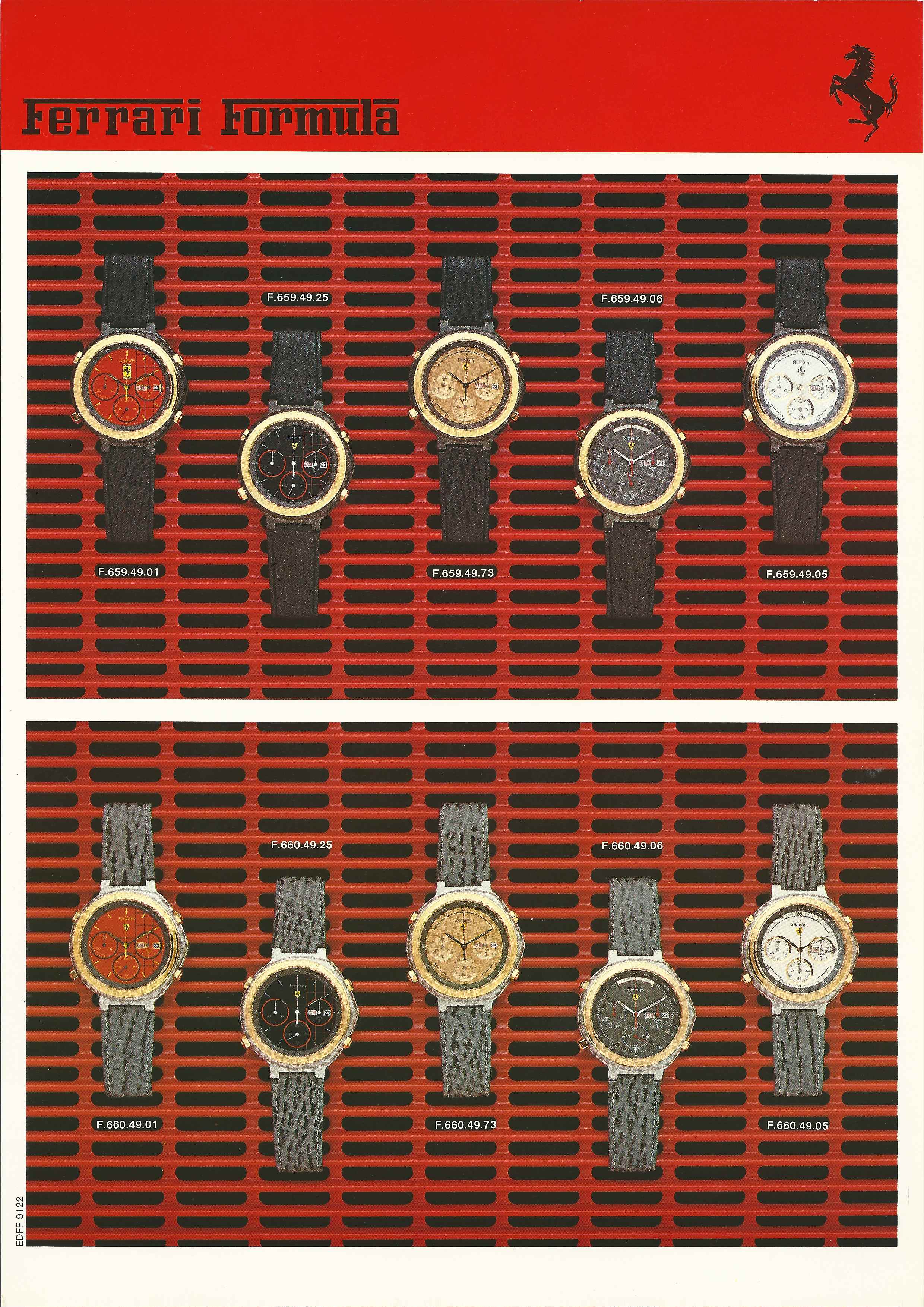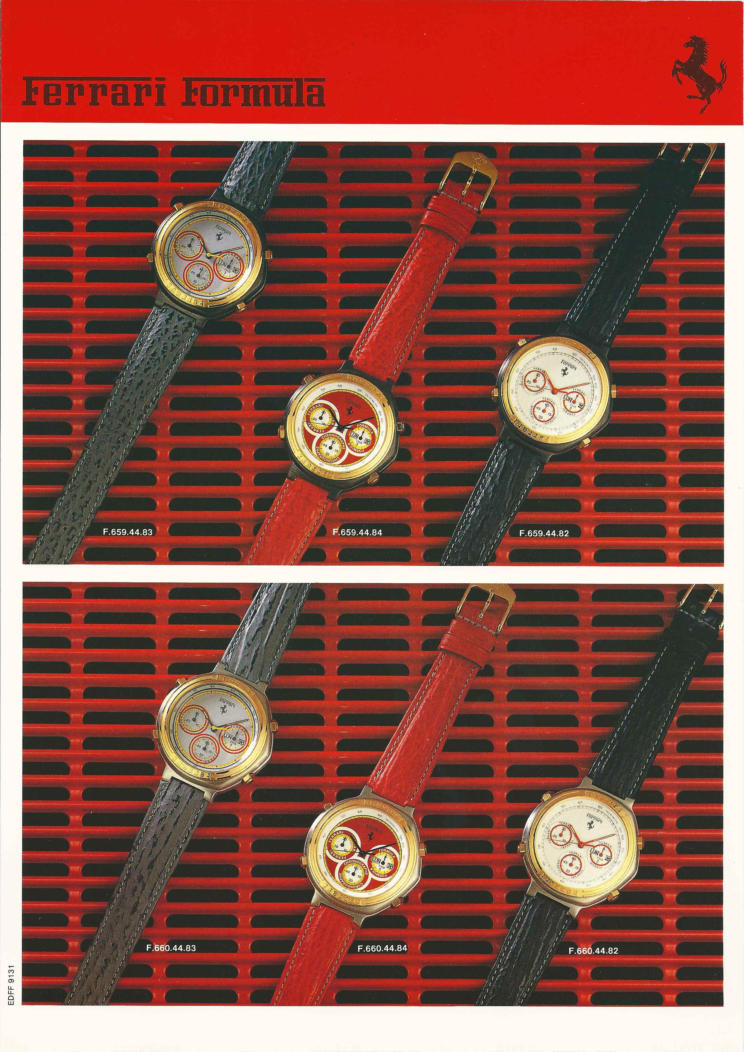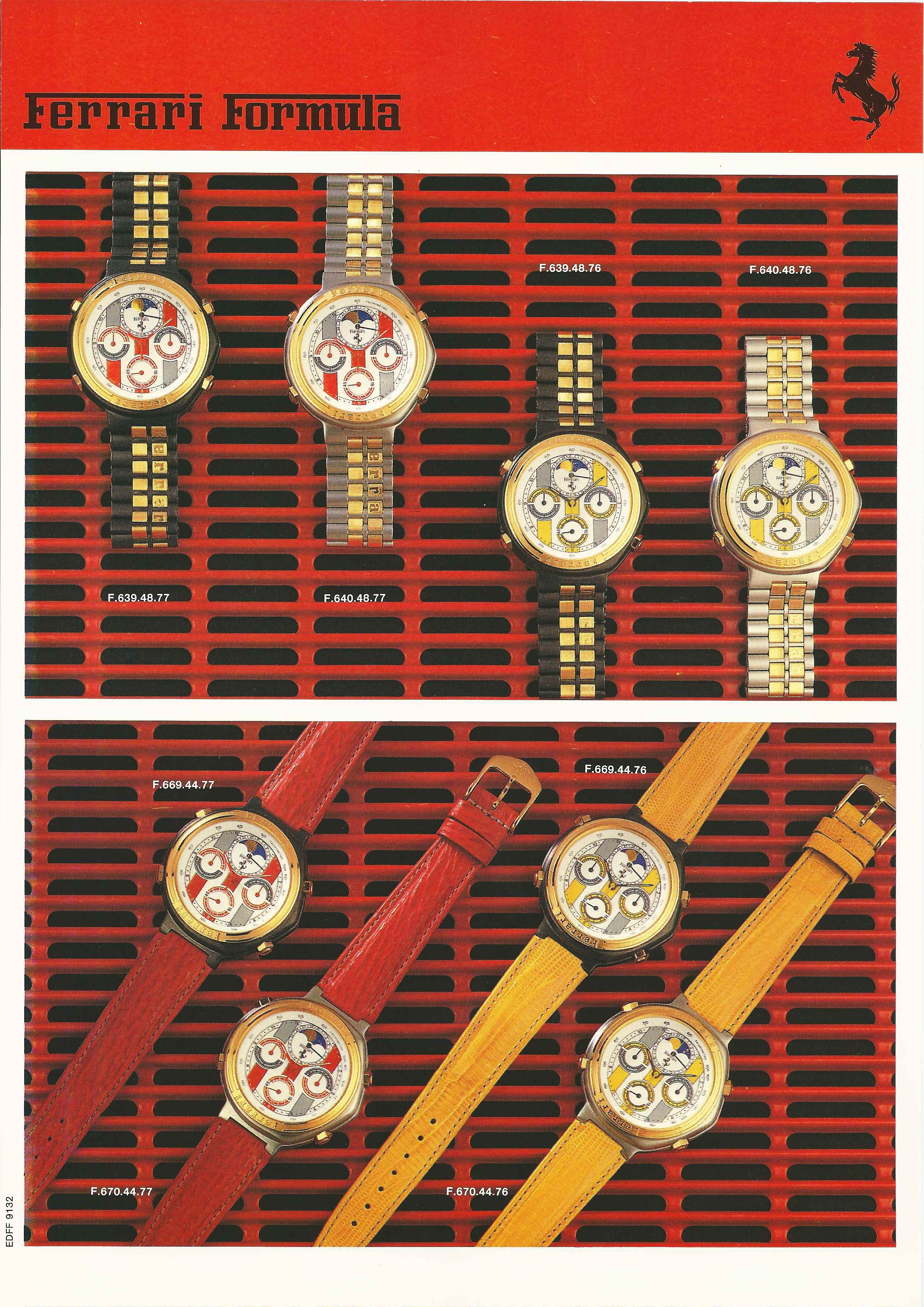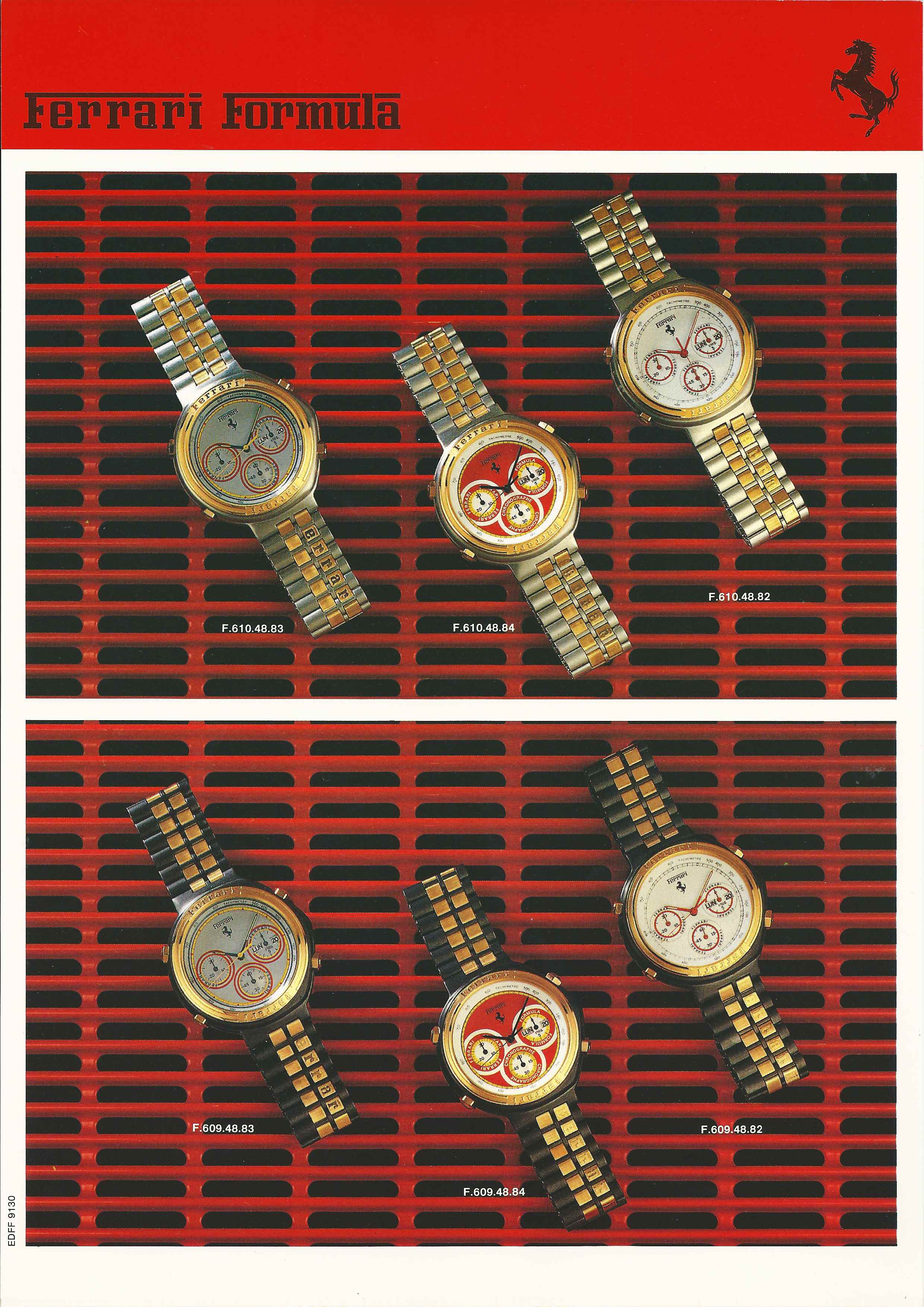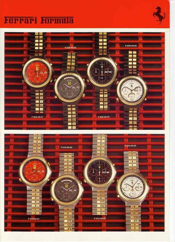 So, at that stage, besides 'the original' F6094801, I had a dozen or so more Ferrari Formula catalogue model codes to play with. Although they all similarly began with F6xxxxxx, I couldn't really see any pattern to them, so I wasn't certain whether (any of) their individual included numbers, or their formats, were significant in any way - or if they were just a random generated sequence. Three weeks ago, I stumbled across a Ferrari Formula website. I posted a link to it on the 'Ferrari Formula Fever - Red Mist' thread. http://ferrari-watches.weebly.com/ - it documents the amazing collection belonging to our newest forum member, Geert. Nobody's commented on the link as yet. I hadn't really got much past this page, myself: http://ferrari-watches.weebly.com/chrono.html which shows just the Cal. 531 (7A38), Cal. 532 (7A48) and Valjoux 7750 chrono' (40 watches !!) section of Geert's huge collection. But at the weekend I had more time to look around and found this page under 'More': http://ferrari-watches.weebly.com/catalogue.html It appears to be a Ferrari Formula dealer's catalogue; A4 loose leaf pages in a hard back ring binder. Amongst those pages was this: As you can see, in this early full version of the catalogue, presumably from 1988, although they contain the same number of digits, the model numbers are split up F.6xx.xx.xx - and there is a distinct pattern to the number sequences used, which define not only the case finish / bracelet or strap fitment, but the last two digits also signify which dial. The familiar F6094801 shown, top left, as F.609.48.01. | |