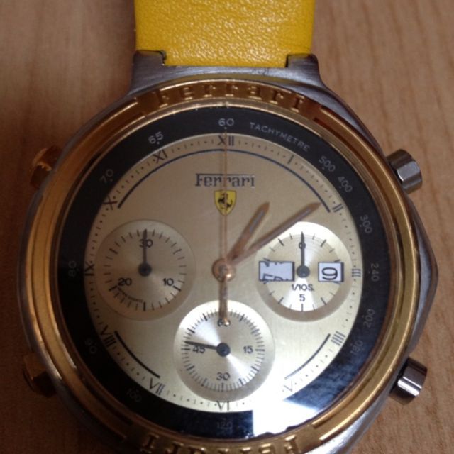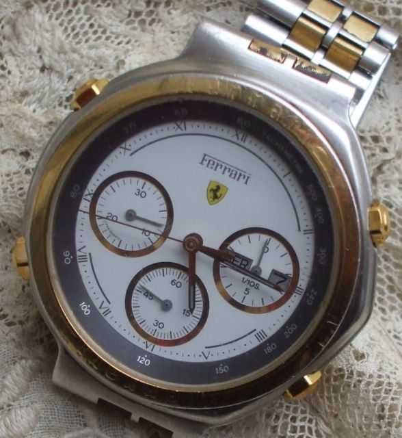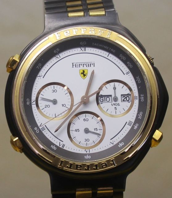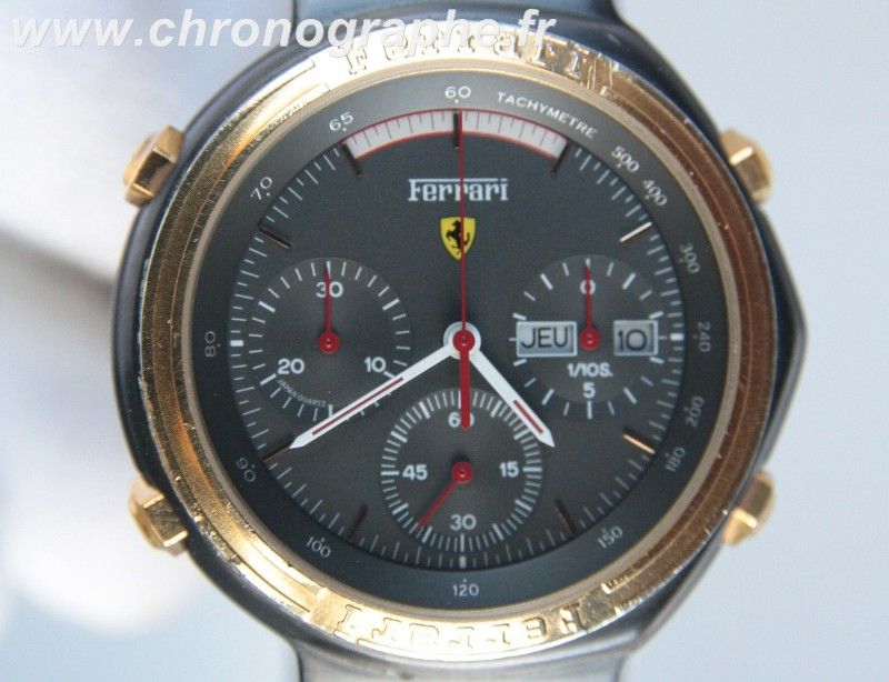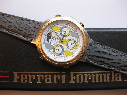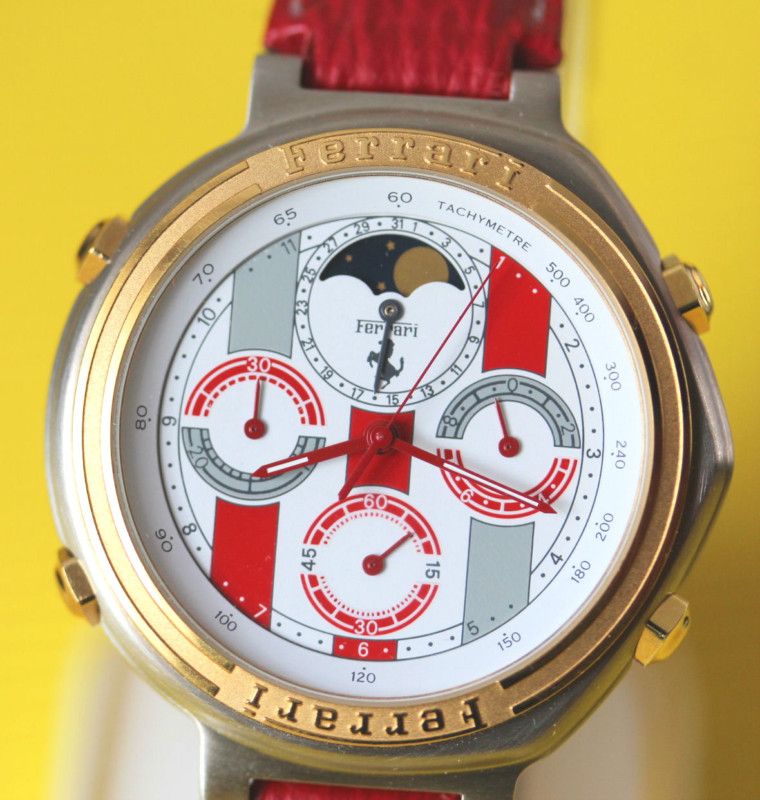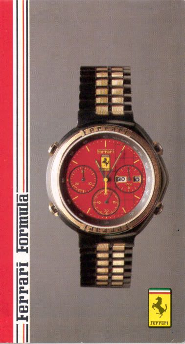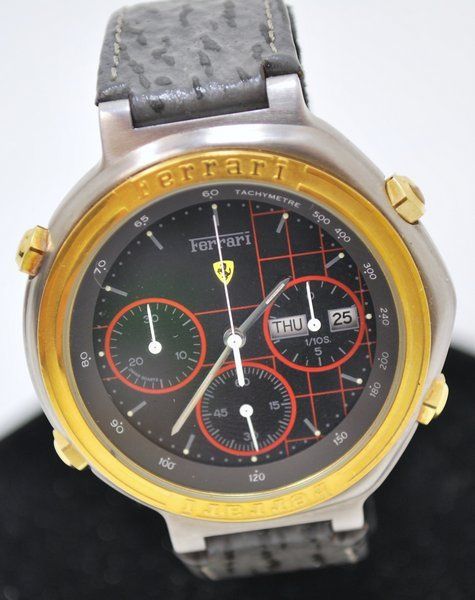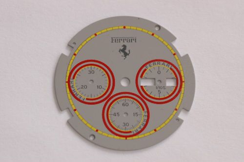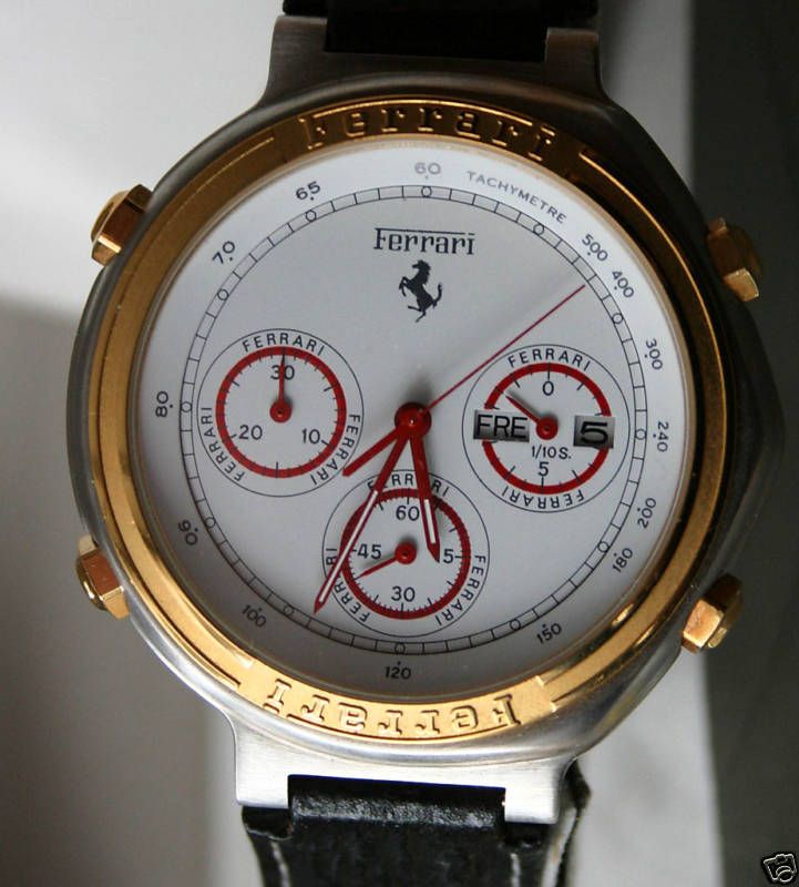 Post reserved for dials used in early style Ferrari Formula Cal. 531's. Uploading suitable photos first - text to follow soon. So let's start at the beginning with 01 - the red 'TestaRossa' dial. Apologies for re-posting these 3 photos from the 'Red Mist' thread, but they're the best close-up shots of these variations I've seen. ------------------------------------------------------------------------------------------------------------------------------------------------------------------------- The dark grey 06 dial: More photos from this recently ended eBay listing here: http://www.ebay.co.uk/itm/181133614842 ------------------------------------------------------------------------------------------------------------------------------------------------------------------------- The black 25 dial That small-ish image comes from a LiveAuctioneers' listing last November, but it's the clearest shot of the dial I've found. Here's another recently ended eBay auction listing for a black ion / bracelet version: http://www.ebay.co.uk/itm/390598956645 ------------------------------------------------------------------------------------------------------------------------------------------------------------------------- The 05 White Roman numeral dial: More photos from this very recently ended eBay listing: http://www.ebay.co.uk/itm/360664968710 Here's a current eBay listing for a black ion 'JAPAN QUARTZ' (all 3 pusher buttons missing): http://www.ebay.co.uk/itm/181151697058 ------------------------------------------------------------------------------------------------------------------------------------------------------------------------- The 73 Gold Roman numeral dial: Ebay June 2011 'parts watch' in job lot: ------------------------------------------------------------------------------------------------------------------------------------------------------------------------- The 82 White Ferrari sub-dial dial: ------------------------------------------------------------------------------------------------------------------------------------------------------------------------- The 83 Light Grey Ferrari sub-dial dial: ------------------------------------------------------------------------------------------------------------------------------------------------------------------------- The 84 Red Ferrari sub-dial dial: A nice example of the black ion bracelet version with this dial, posted here in a recent thread on the Italian Orologi & Passioni forum. Interestingly, the OP gave his topic the title: Seiko 7A38 Cartier Ferrari - so he's not under any delusions about what's inside it. ------------------------------------------------------------------------------------------------------------------------------------------------------------------------- The Light Grey dial (2-digit suffix currently unknown) not listed in any of the foregoing catalogue brochures: Above image from another recently ended eBay auction: http://www.ebay.co.uk/itm/321135754176 Thread locked until I finish composing / editing it. | |