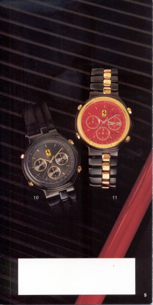 The problem being, particularly part number-wise, I actually had very little in the way of such information available to work from. Back in February 2011 I'd bought a NOS Ferrari dial on eBay, which I subsequently used to build my Franken Ferrari 7A38 watch: It came in a little plastic box with a typical F6xxx xxx format part number label: But I wasn't even 100% certain that the dial was in it's correct original packaging. Here's a full hand set for the dark grey dialed version that I found online - their spare part number is of a similar F 6xxxx xxx format: But as you'll see develops, like my dial, this part number other than beginning in F6, bears little or no relation to the dial it's used on. Product code-wise, I'd known for some time that the first Cartier Ferrari Formula '7A38' introduced - a.k.a the 'TestaRossa' model: was catalogue model # F6094801. I'd even been fortunate to have found written evidence of that on a few eBay listing photos: But I'd seen far more warranty cards like that, where dealers had filled in the watch's serial number instead of using the product code, and even a few cases where the F6xxxxxx product codes were patently obviously written incorrectly - either that or the watches were being offered for sale with papers that didn't actually belong to that particular watch. I won't bother posting any of those examples, as they'll only serve to confuse, but it goes without saying that they were mostly being offered by second-hand watch dealers, who really should know better. Naturally, selling them 'with box and papers' can add a couple of hundred euros to the price of a watch like these. Last March I picked up a couple of Ferrari Forumula brochures on eBay. It's price list dated one from September 1989; the other was undated but I reckon it's from around 1991. I've already posted the scans in the 'Ferrari Formula Fever - Red Mist' thread, but it won't hurt to copy them over to this thread, particularly because the 1989 brochure has model code captions against the illustrations:
